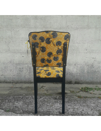 Le passepoil noir qui souligne le tissu apporte une finition soignée, tandis que le bois de la chaise a été peint avec une peinture bio-sourcée de la marque ÉLÉONORE DÉCO, coloris Abysse. Ce choix de matériau témoigne de notre engagement pour un mobilier éco-responsable et de qualité, conçu en Bretagne.