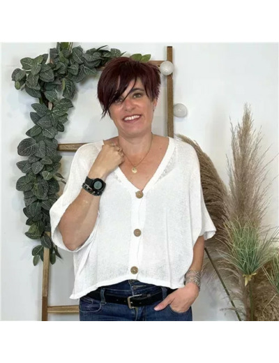 Gilet court en maille avec un col V, boutons et des manches courtes.
