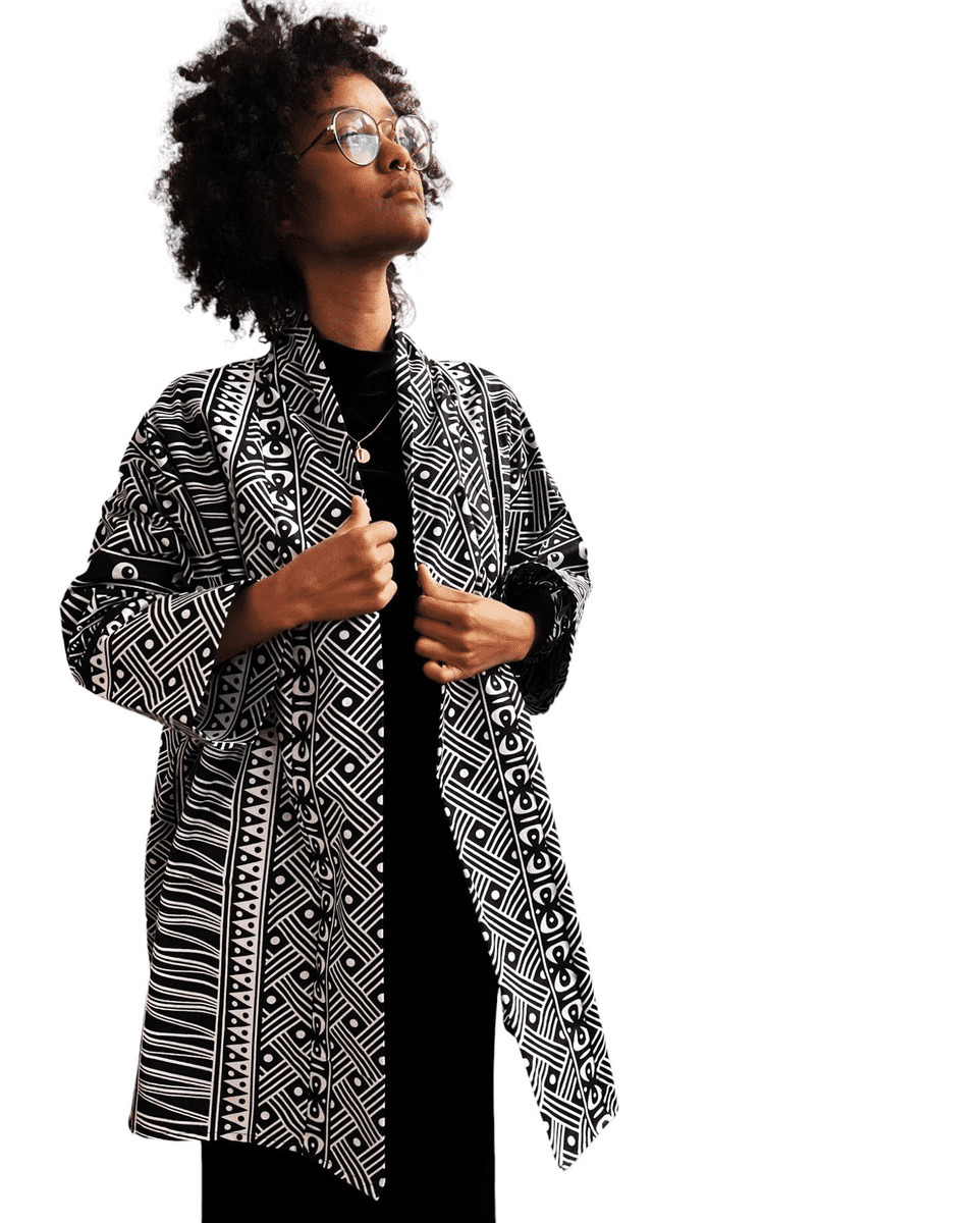 Obtenez un look estival élégant avec ce kimono femme bogolan en tissu africain. Avec ses manches longues et son design unique noir et blanc, ce kimono léger et ample est parfait pour toutes les occasions. Comprend une ceinture pour un ajustement personnalisé.