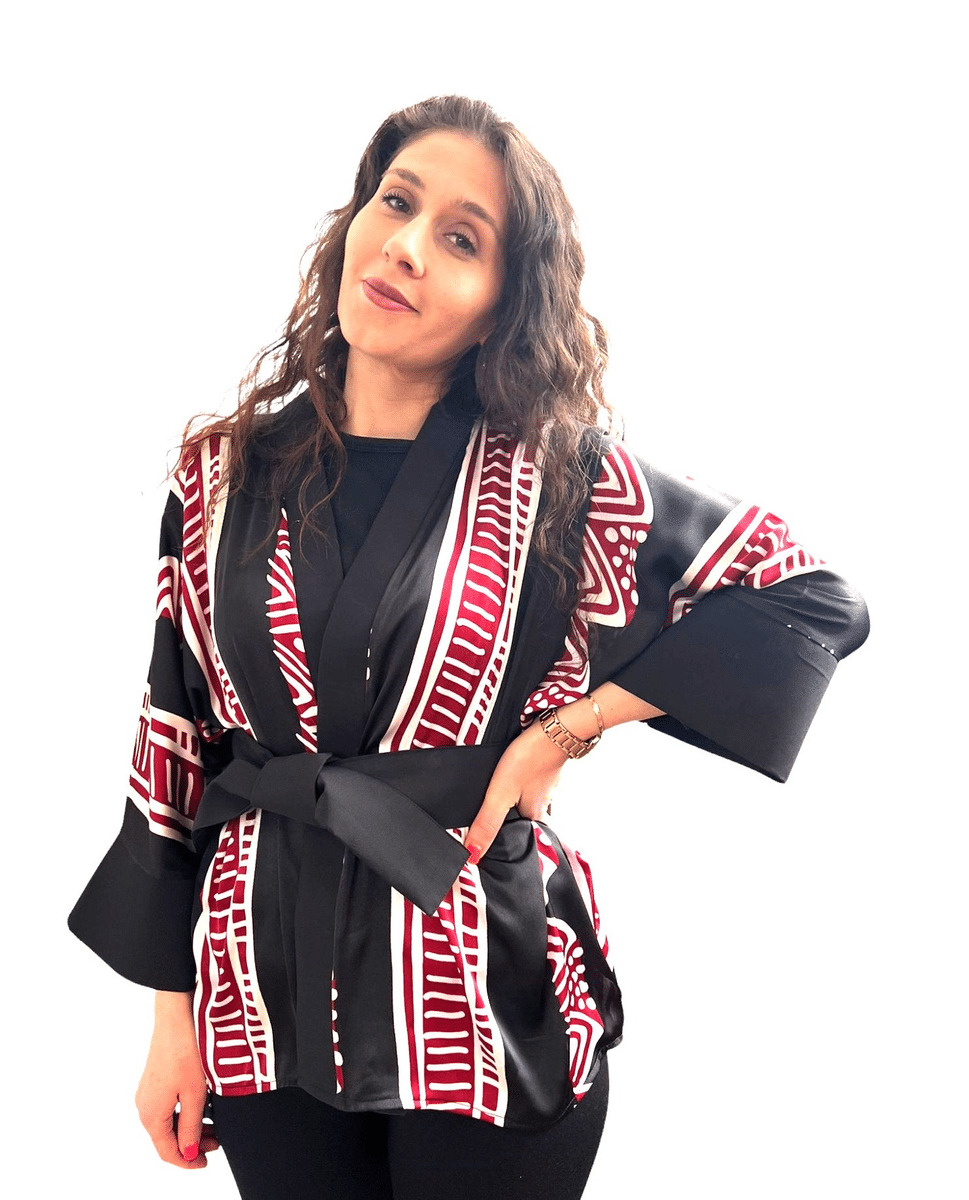 Ce kimono en soie pour femme est à la fois classique et élégant avec ses manches longues et sa coupe courte. Confectionné avec un tissu doux et souple de haute qualité, il vous offrira un confort inégalé. Disponible en trois couleurs: rouge, noir et blanc, ce kimono apportera une touche stylée à vos tenues.