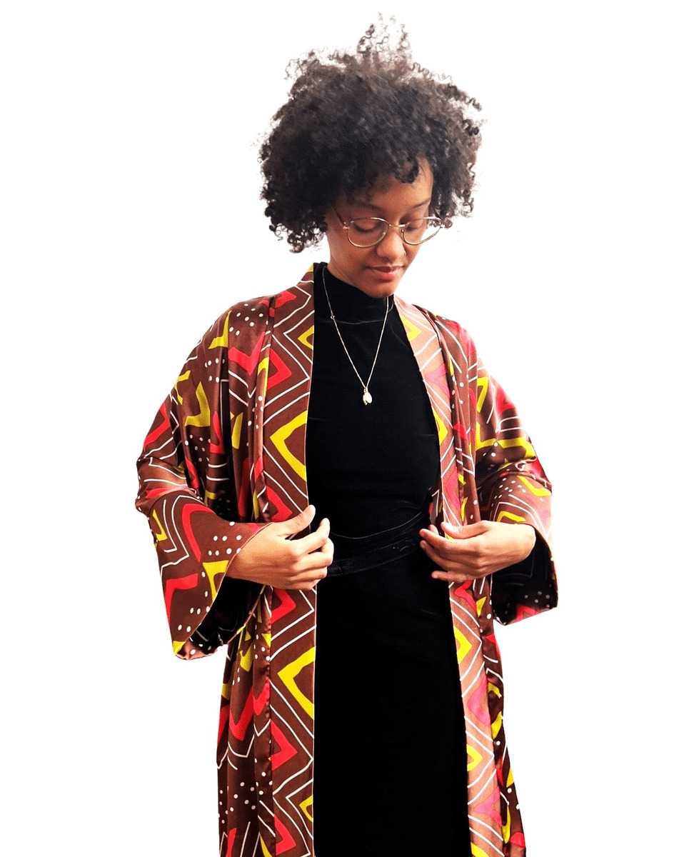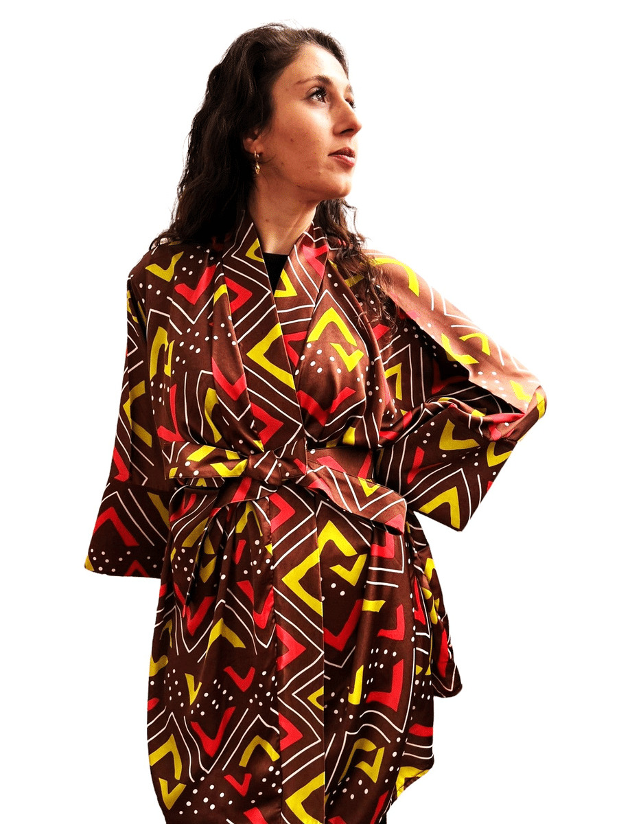 Ce kimono en soie pour femme est le choix idéal pour une tenue féminine et confortable. Les manches longues ajoutent une touche élégante et la soie offre une texture douce et souple. Avec son imprimé unique, vous serez sûre de vous démarquer avec style. Parfait pour toutes les occasions.