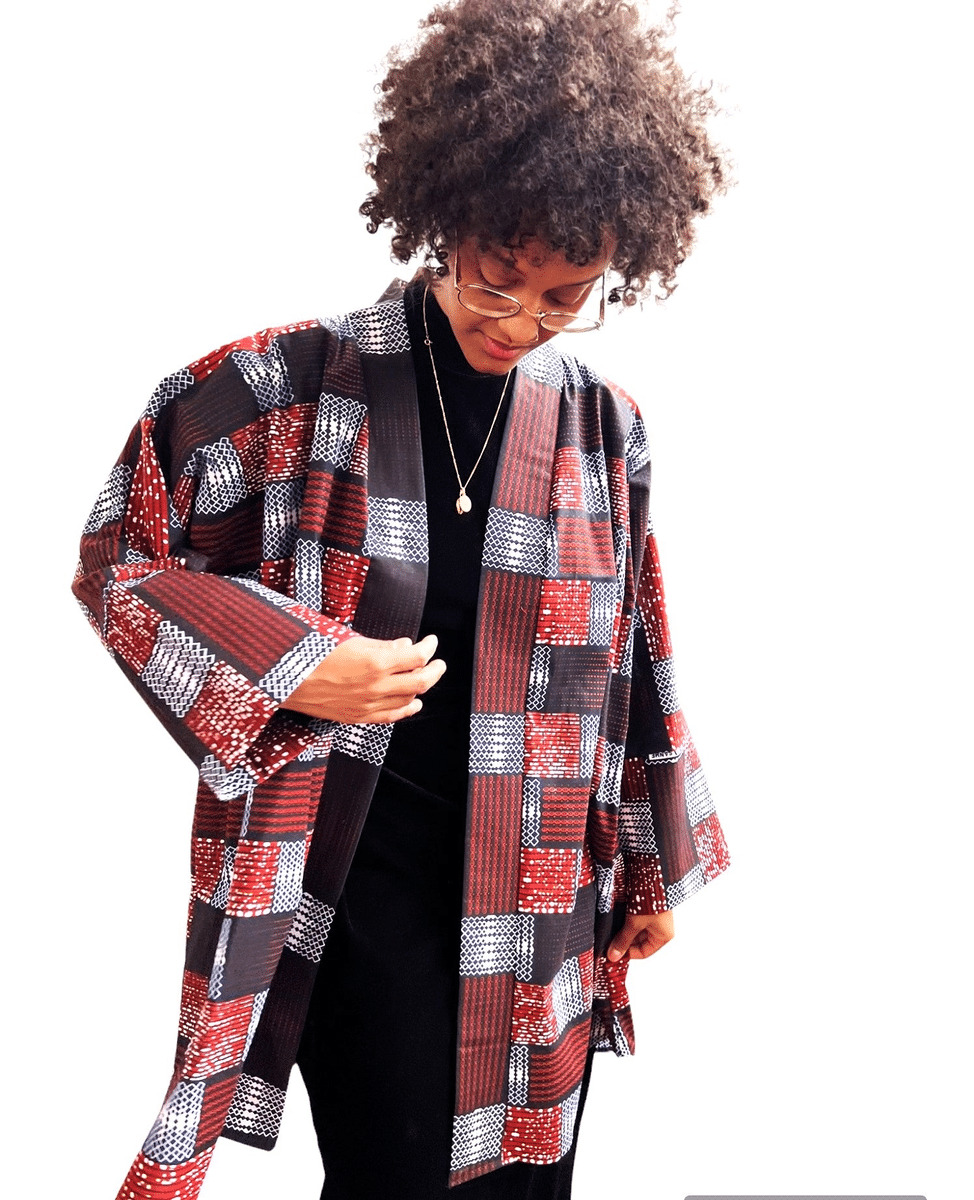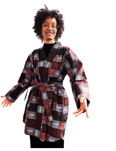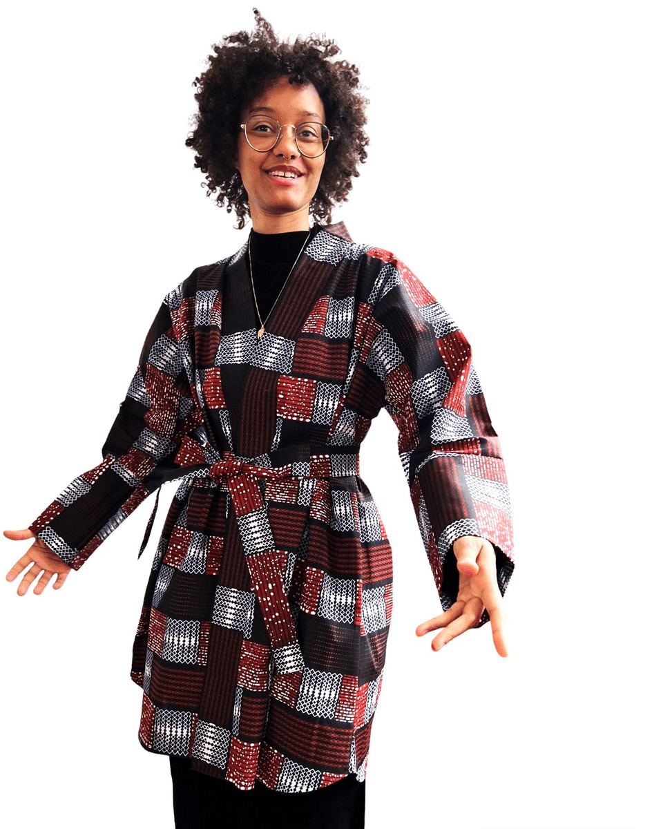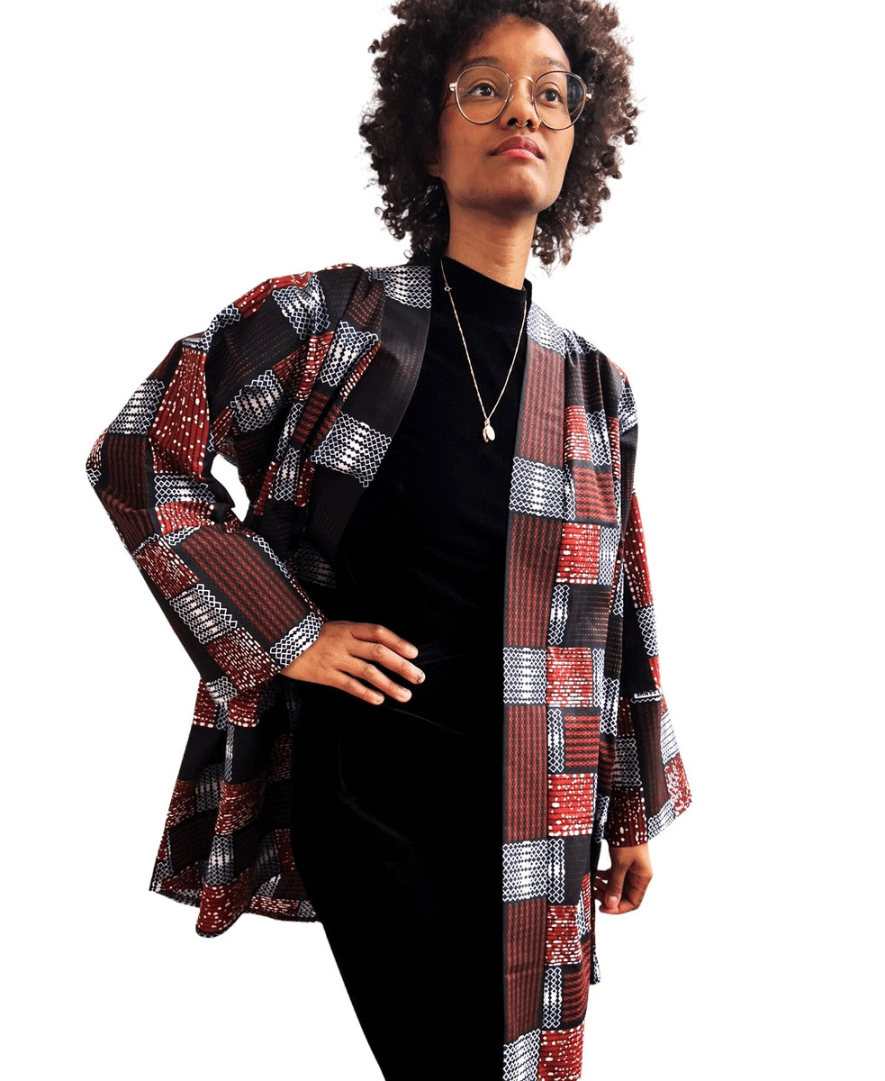 Ce kimono en tissu wax, léger et idéal pour l'été, est fabriqué en coton de couleurs marron, rouge et beige. Avec sa mi- longueur et ses manches longues, il vous offre un look à la fois décontracté et élégant. Parfait pour toutes les occasions !