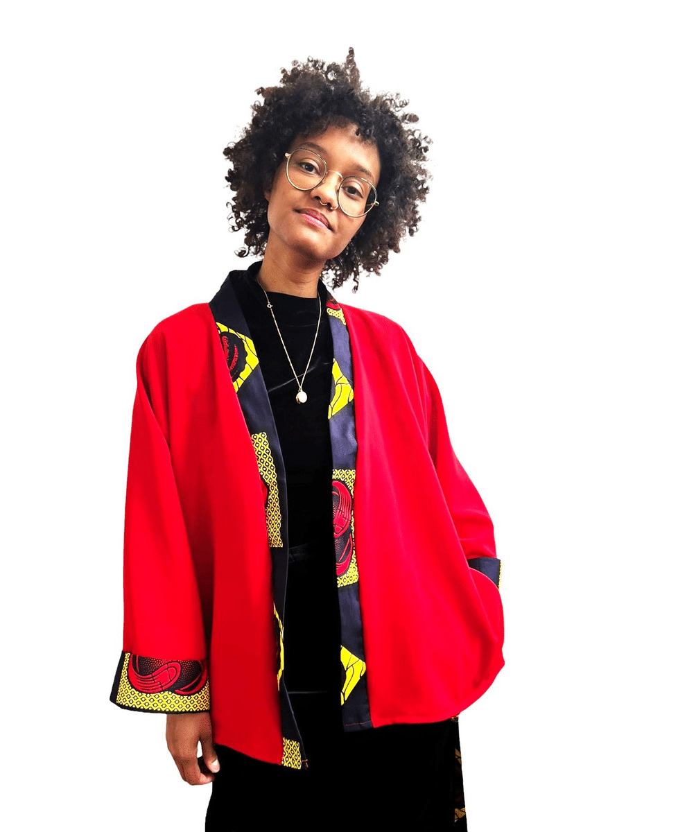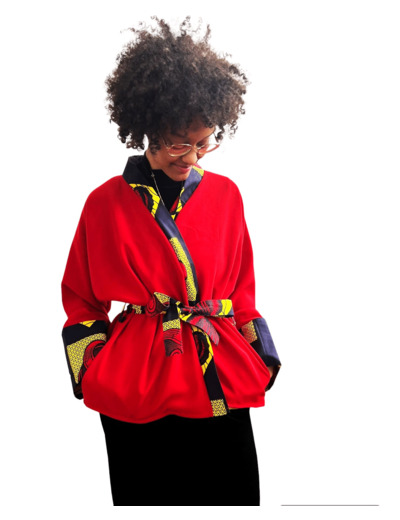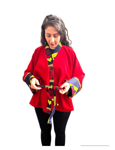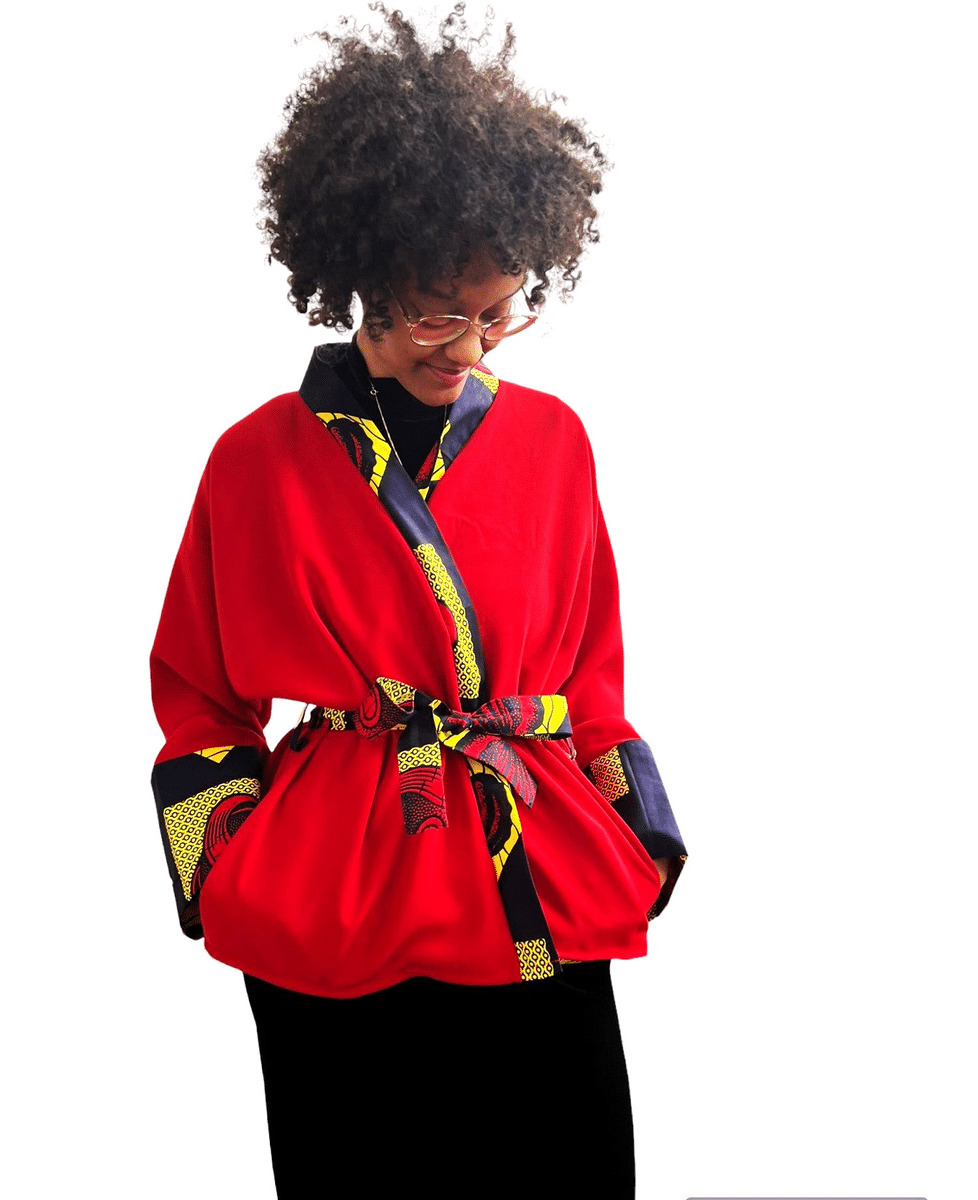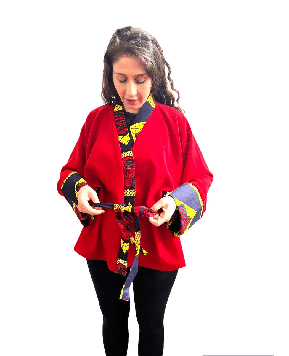 Ce kimono rouge en tissu souple et doux est l'ajout parfait à votre garde-robe d'été. Avec son motif wax aux couleurs bleu, jaune et rouge, ce kimono court pour femme est à la fois élégant et confortable. Profitez du style et du confort avec ce kimono unique.