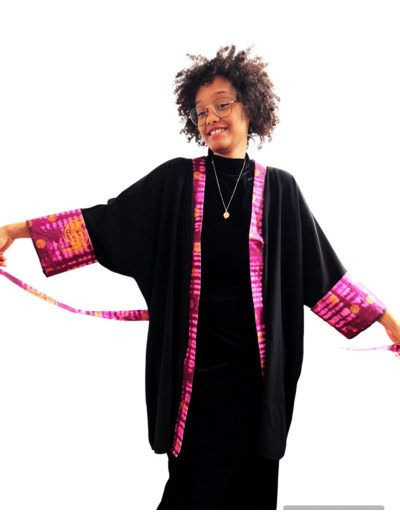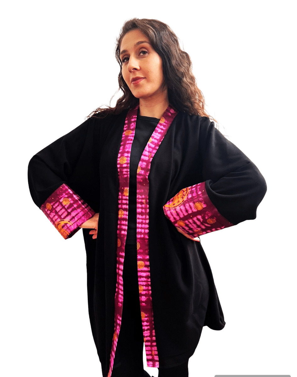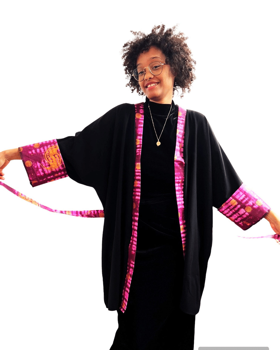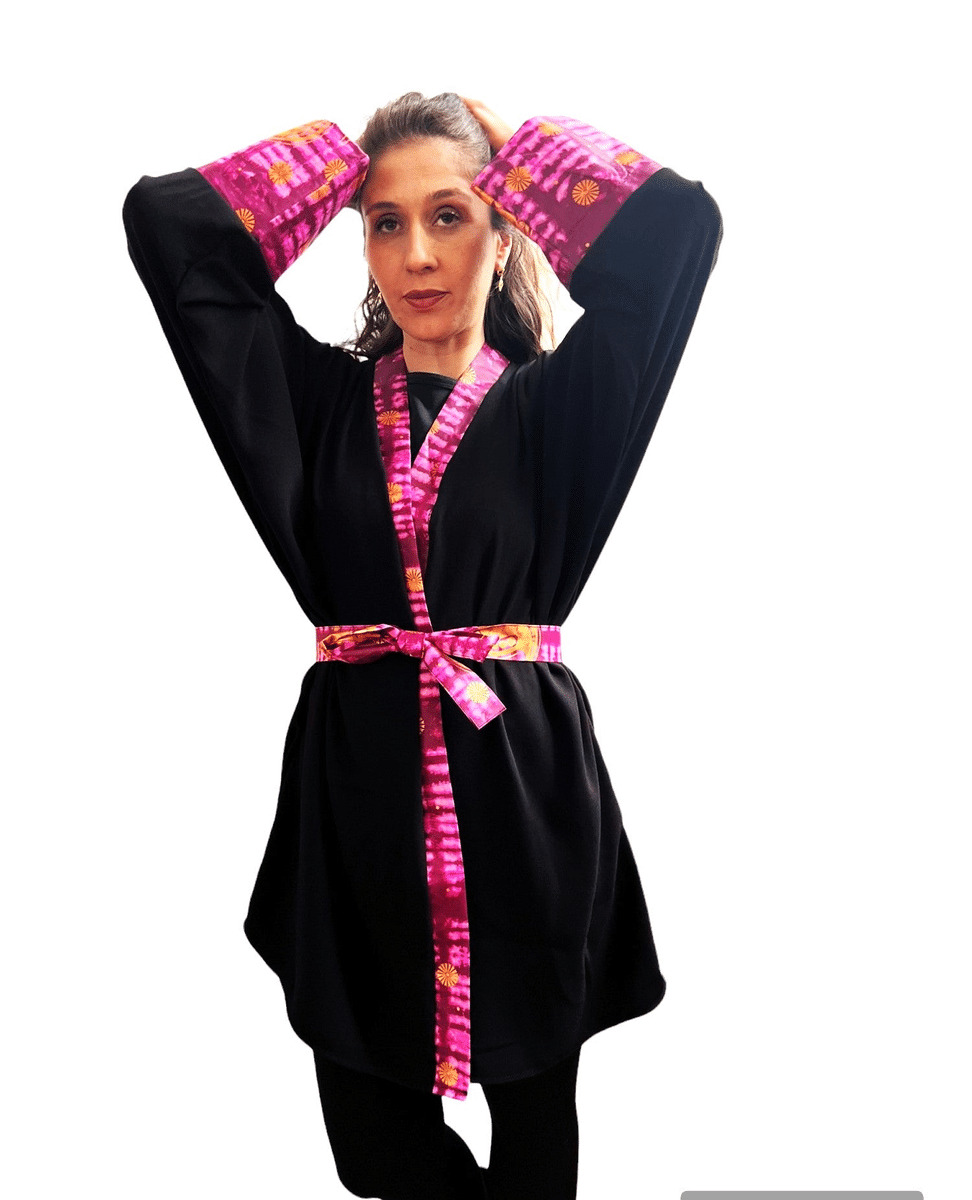 Ce kimono noir mi-long en tissu souple est parfait pour la mi-saison. Assorti avec du tissu africain Bazin coloré, il apporte une touche chic et élégante à tout évènement. Découvrez la beauté de la fusion de deux styles dans ce vêtement pour femme. Osez l'originalité et l'unicité avec ce kimono.