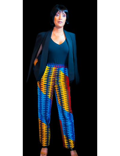 Ce pantalon en wax coupe droite, taille ajustable, est idéal pour les sorties de fête.