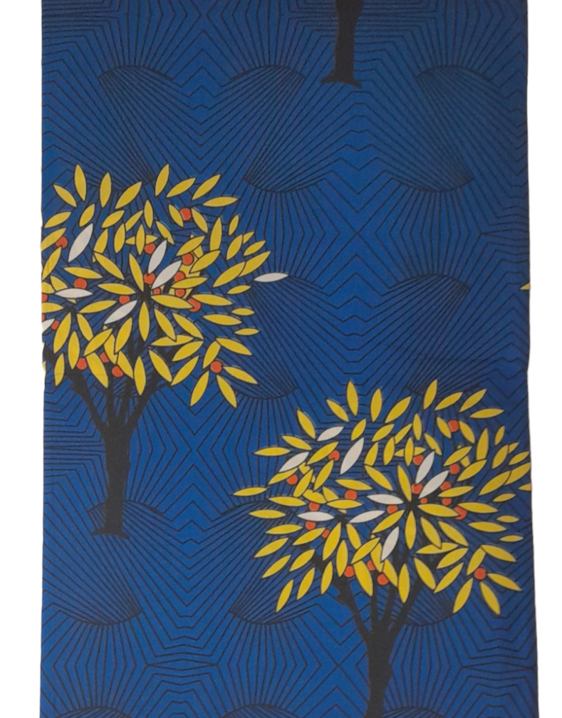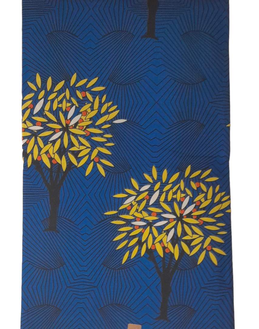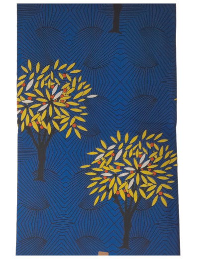 Notre tissu wax coton est caractérisé par des motifs d'arbres colorés. La composition en 100% coton est douce et légère au toucher et offre une bonne tenue. Les jolies couleurs bleu et jaune créent une ambiance festive et joyeuse dans votre intérieur.