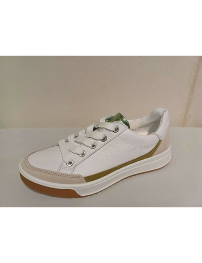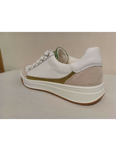 Baskets en cuir lisse blanc avec cuir veours beige et vert, haut de la alanguette vert brillant de chez Ara.