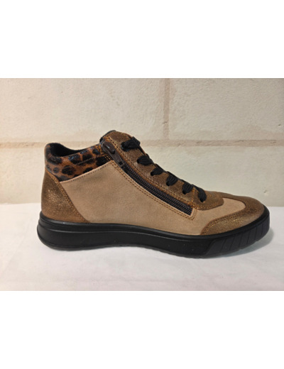 Baskets tige montante en cuir velours beige et cuir bronze avec fantaisie léopard de chez Ara.