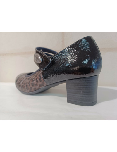 Escarpin en cuir vernis noir et fantaisie léo avec brdide de chez Dorking.