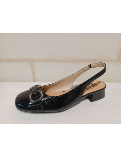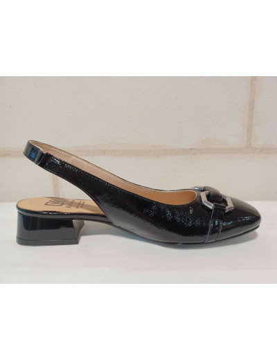 Escarpins bride arrière en cuir vernis noir avec boucle métal argent de chez Dorking.