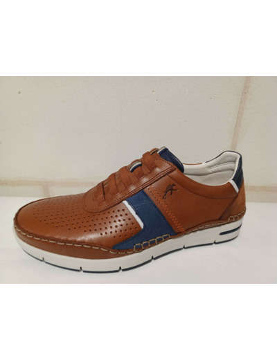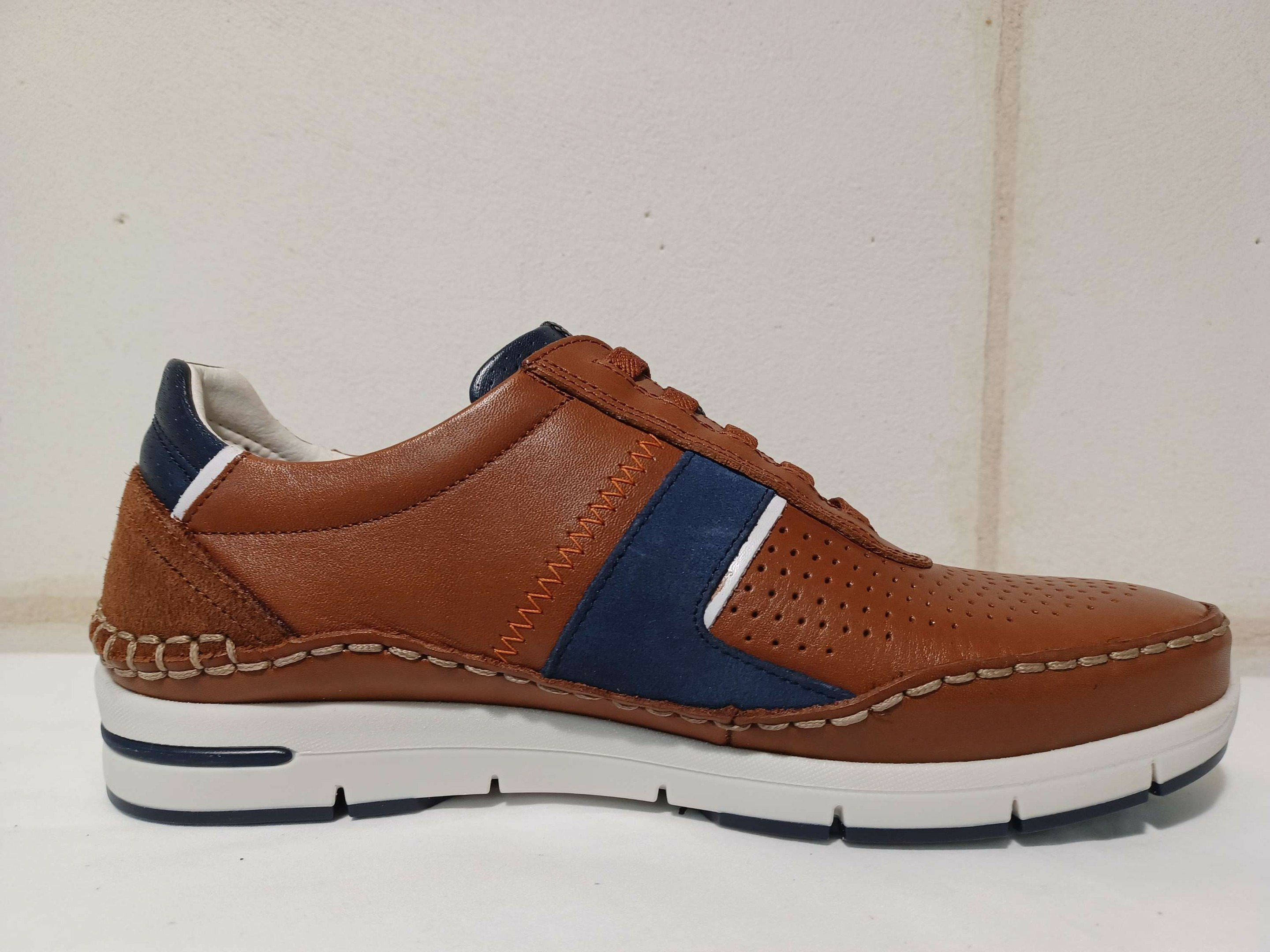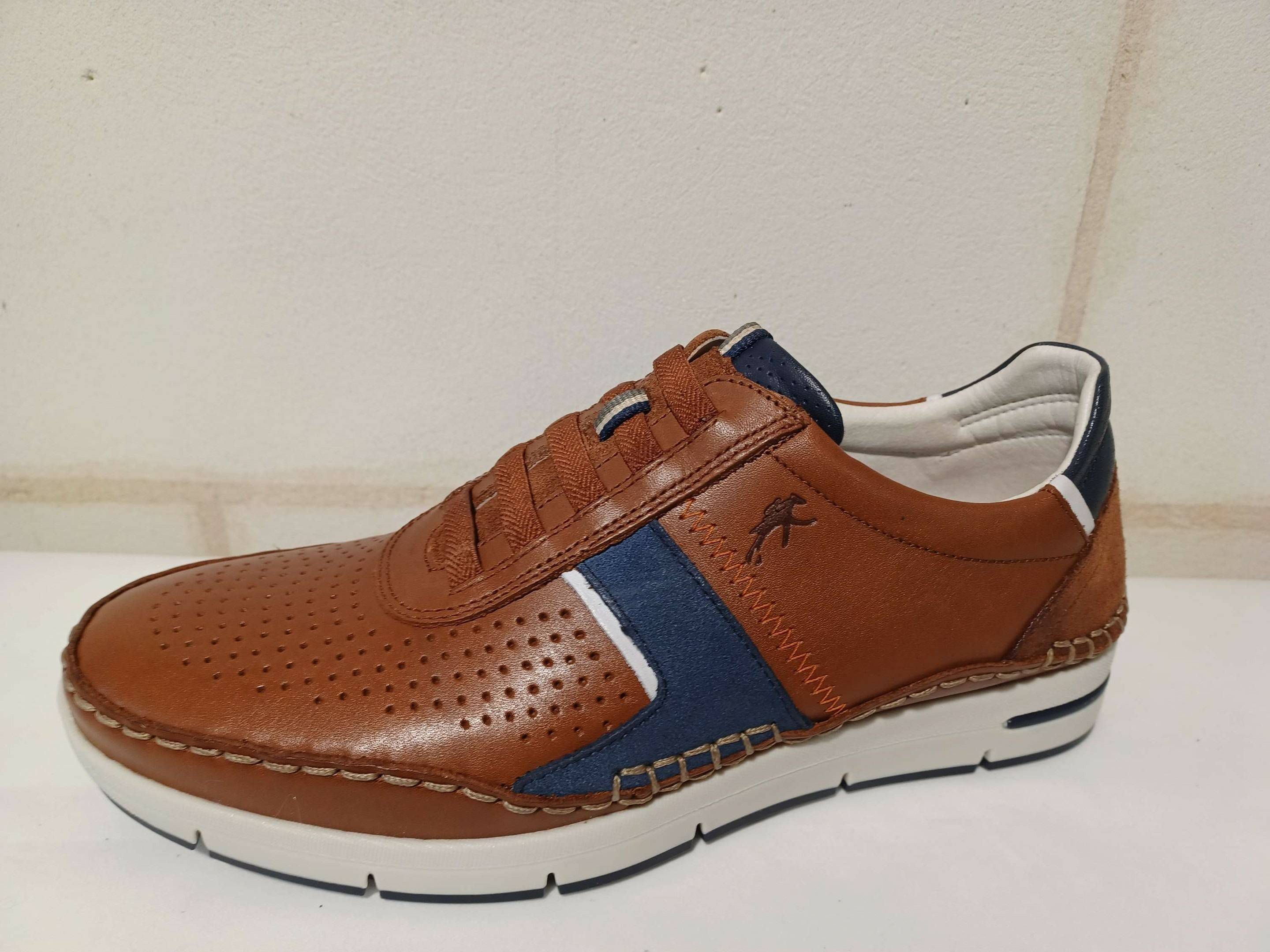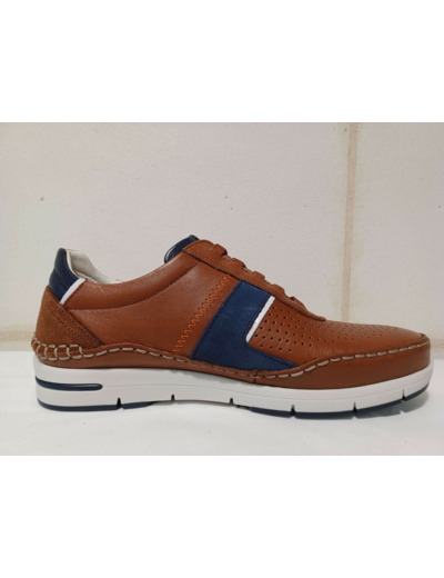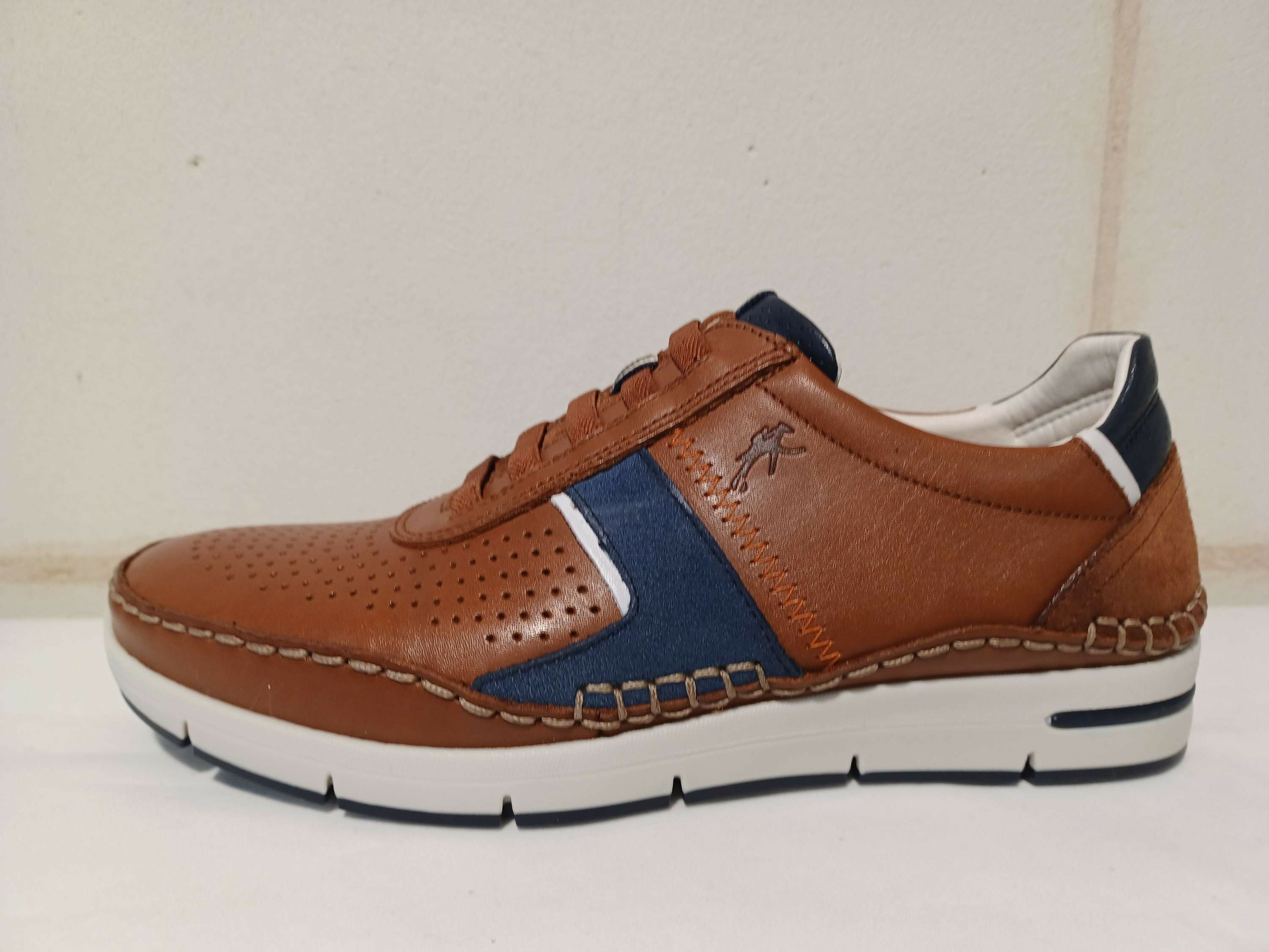 Baskets sans gène en cuir camel et bleu fantaisie de chez Fluchos.