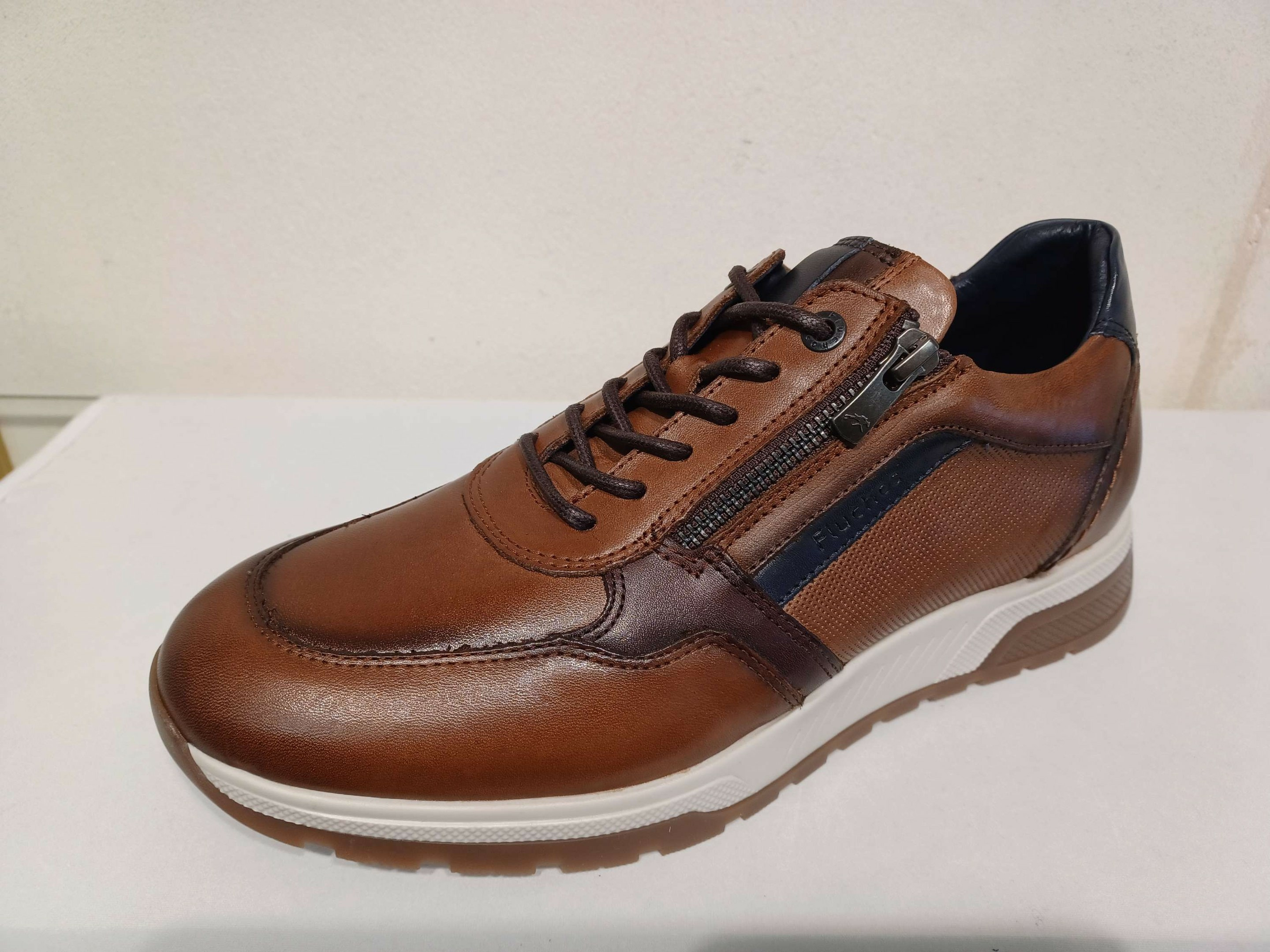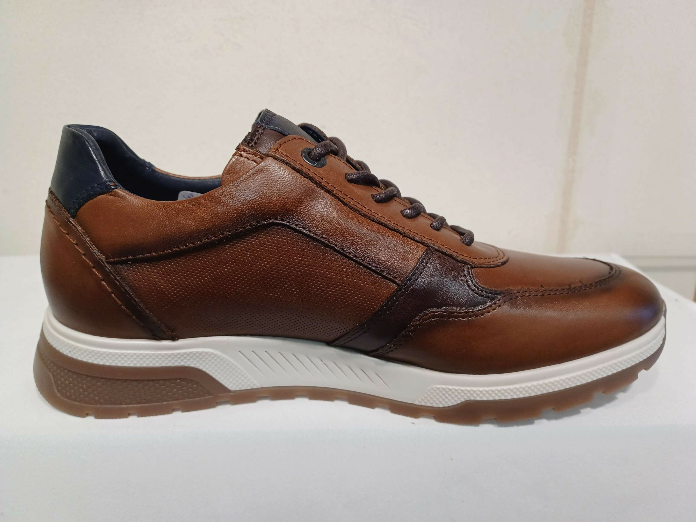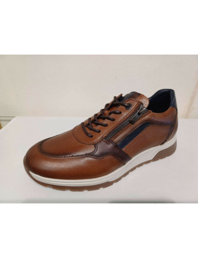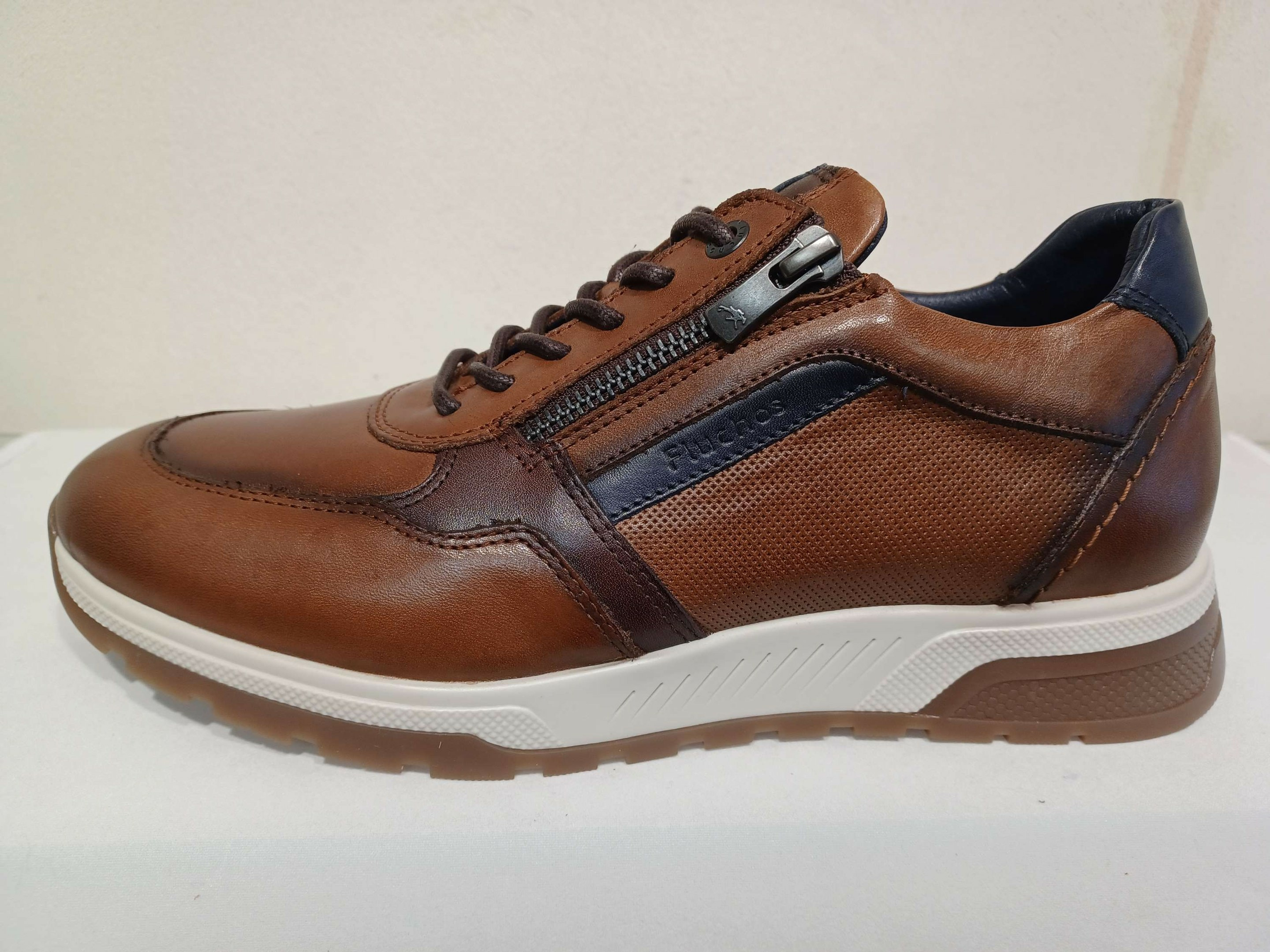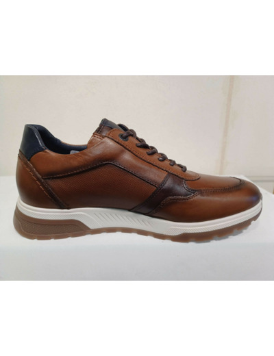 Baskets de ville en cuir cognac et arrière talon marine de chez Fluchos.
