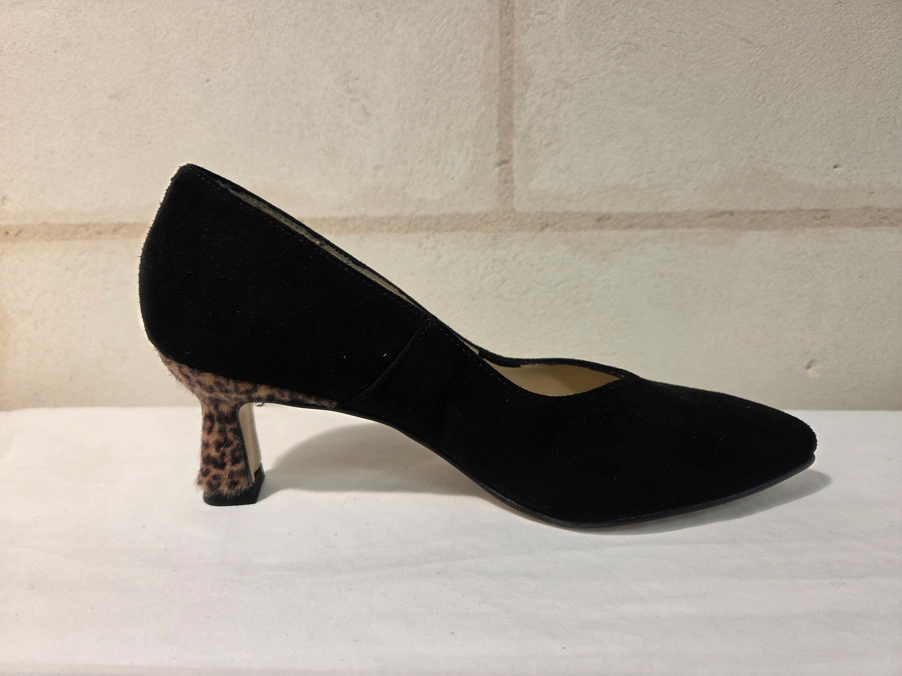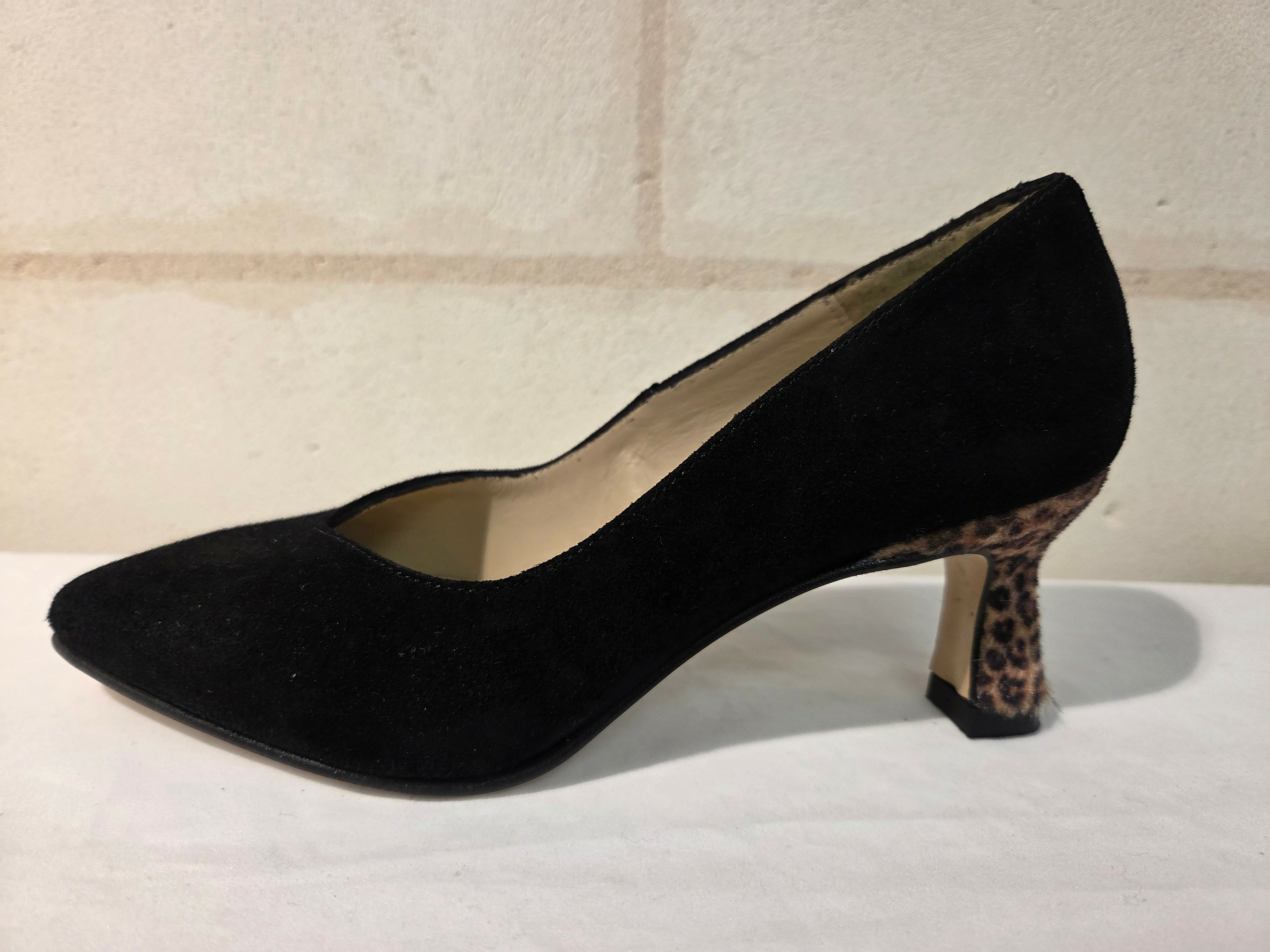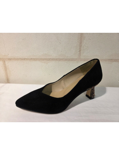 Escarpins en cuir velours noir avec talon fantaisie léopard de chez Folie's.