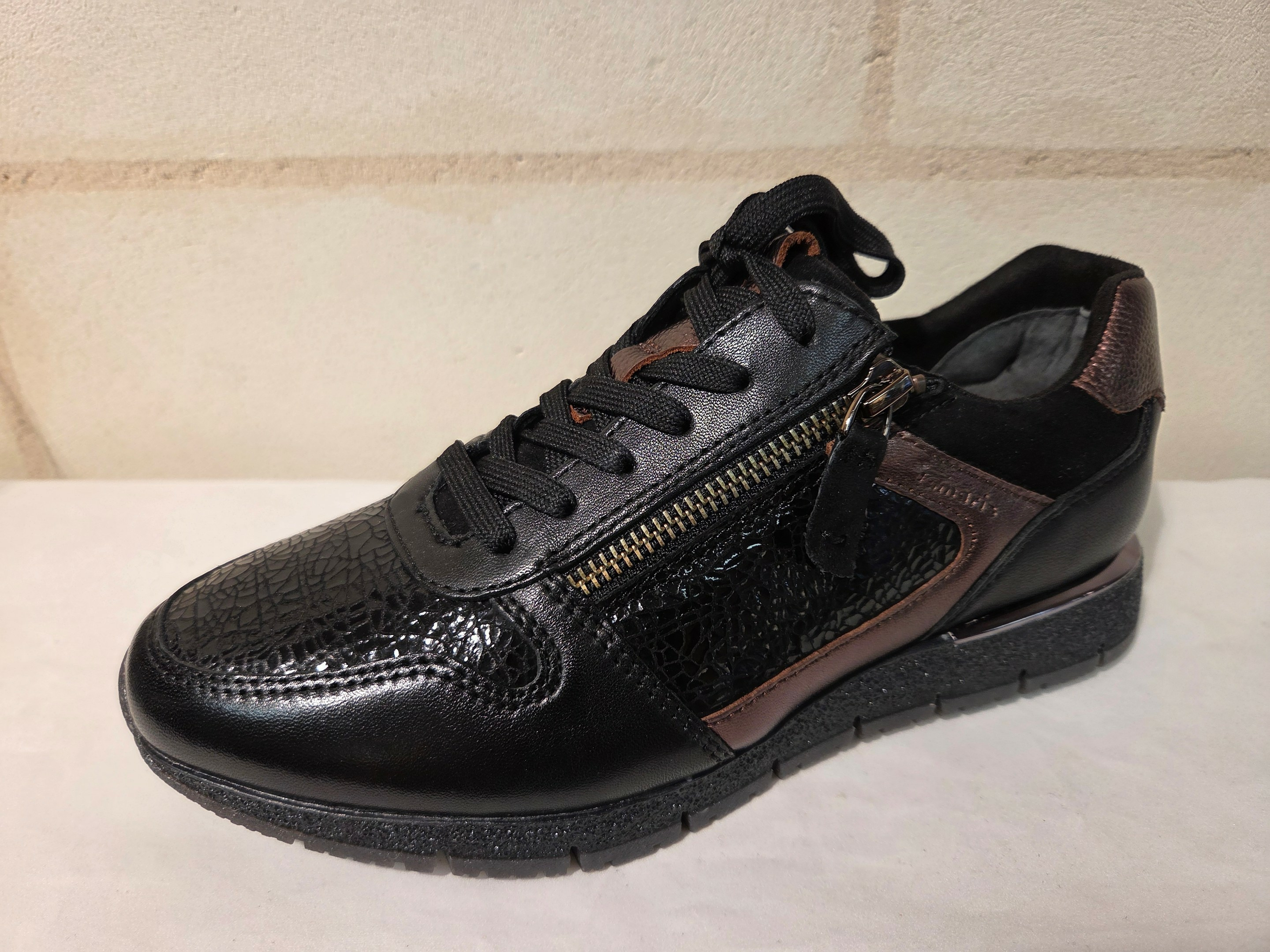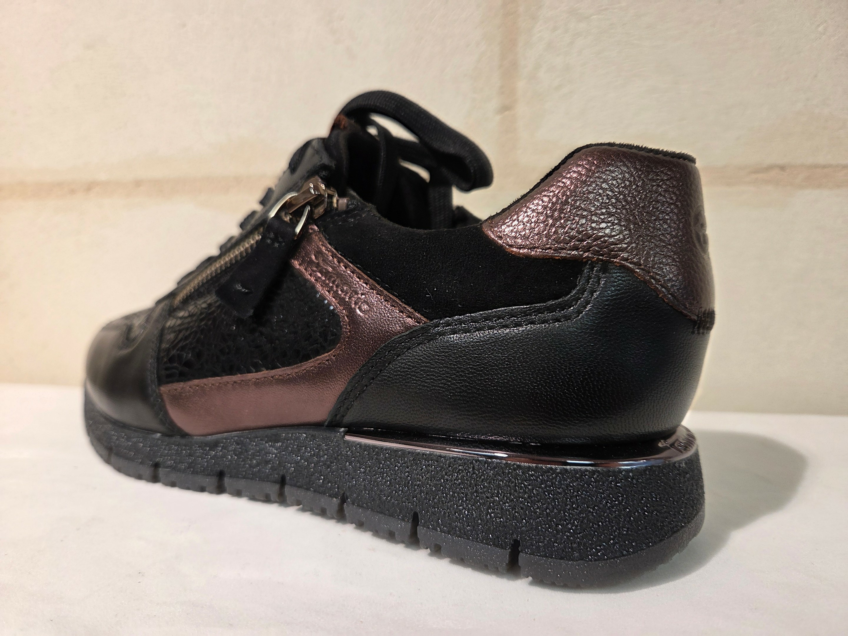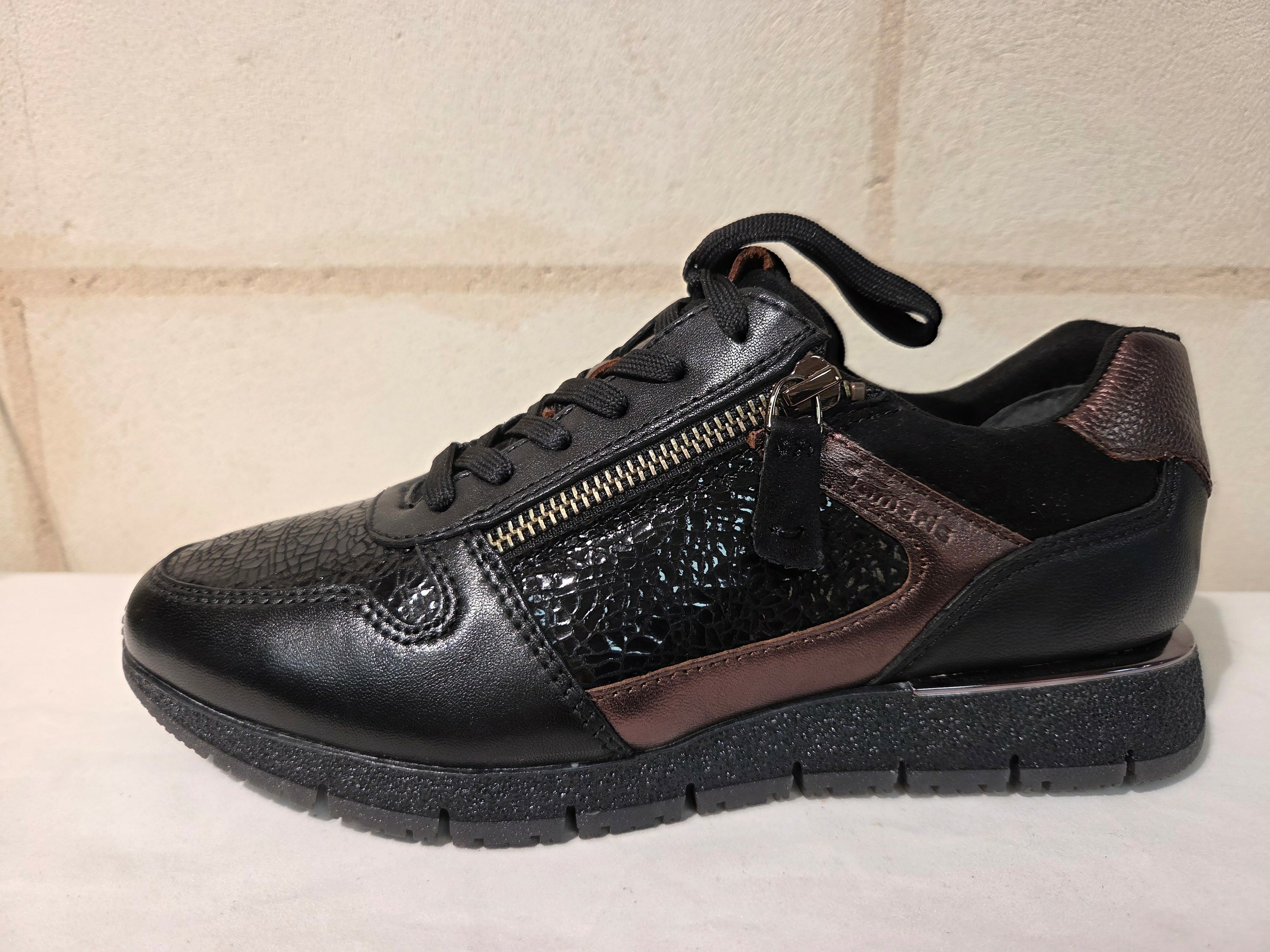 Baskets en cuir noir et cuivré de chez Tamaris.