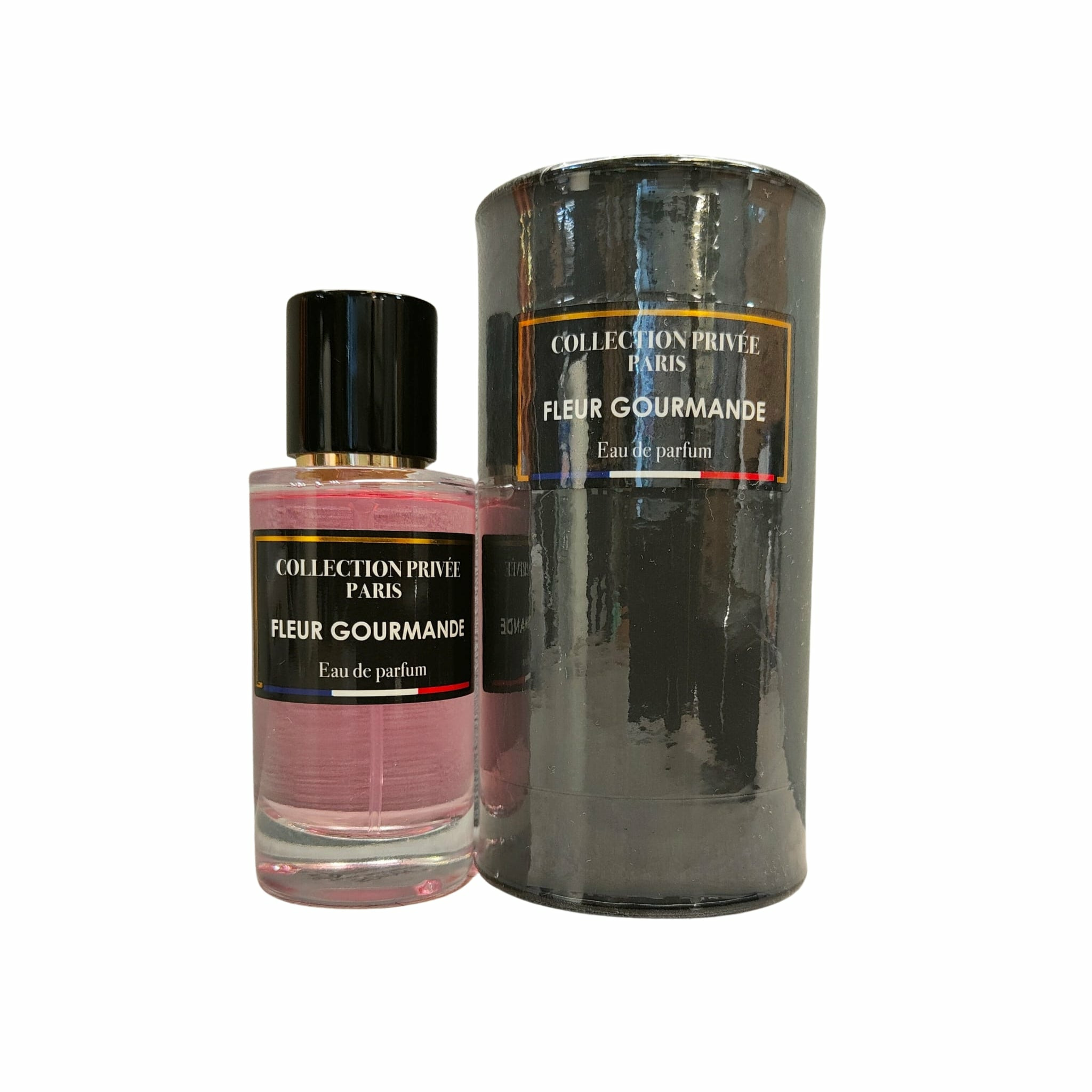 Fleur Gourmande – Collection Privée Paris – 50 ml : Une ouverture fruitée (poire, framboise, bergamote) s’épanouit en un bouquet de fleur d’oranger, jasmin et rose, posé sur une base vanillée, pralinée et musquée.