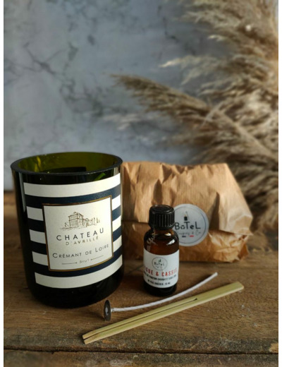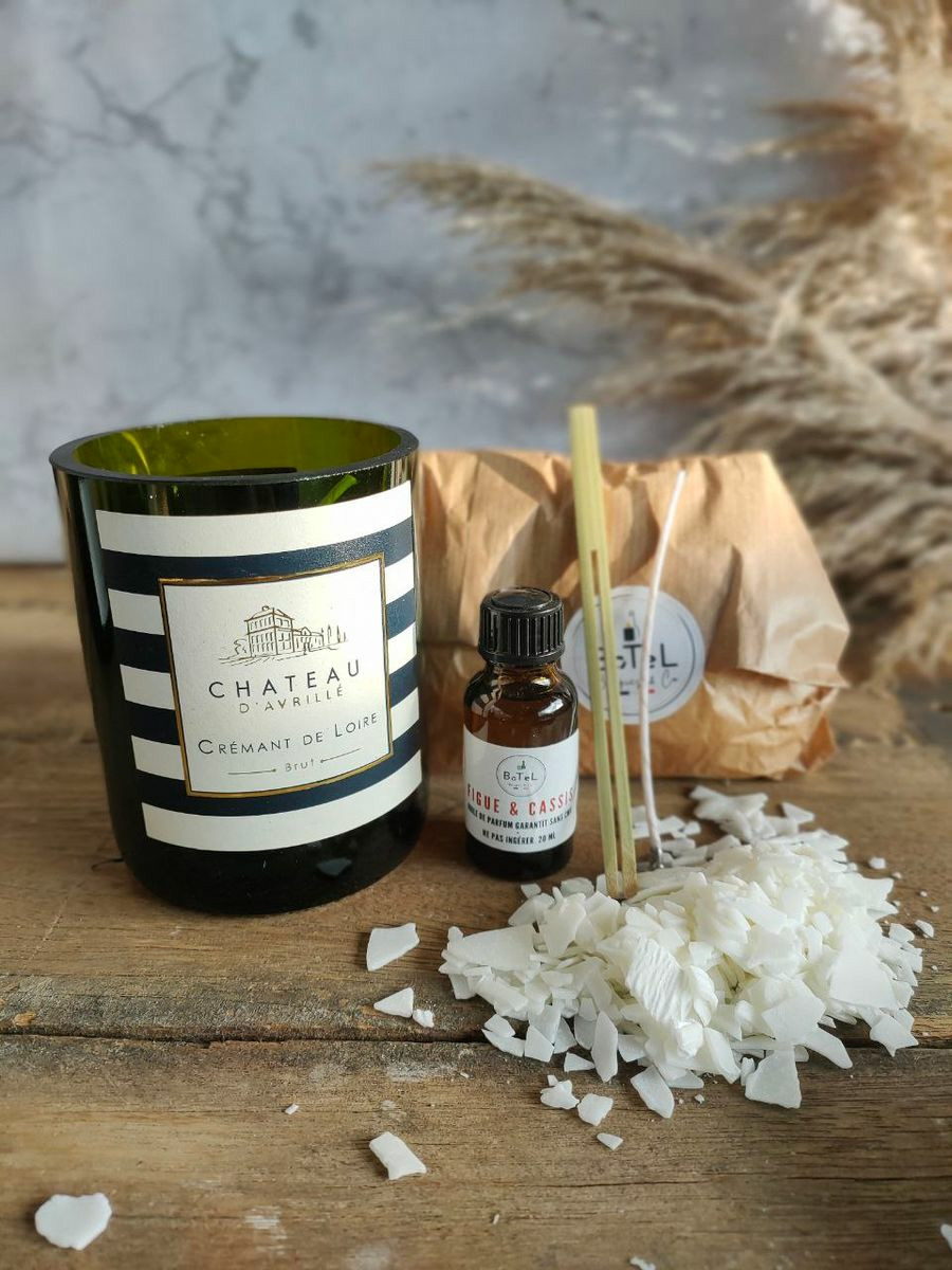 Dans notre kit, vous avez tous les éléments nécéssaires à la fabrication d'un bougie dans une bouteilles de vin.