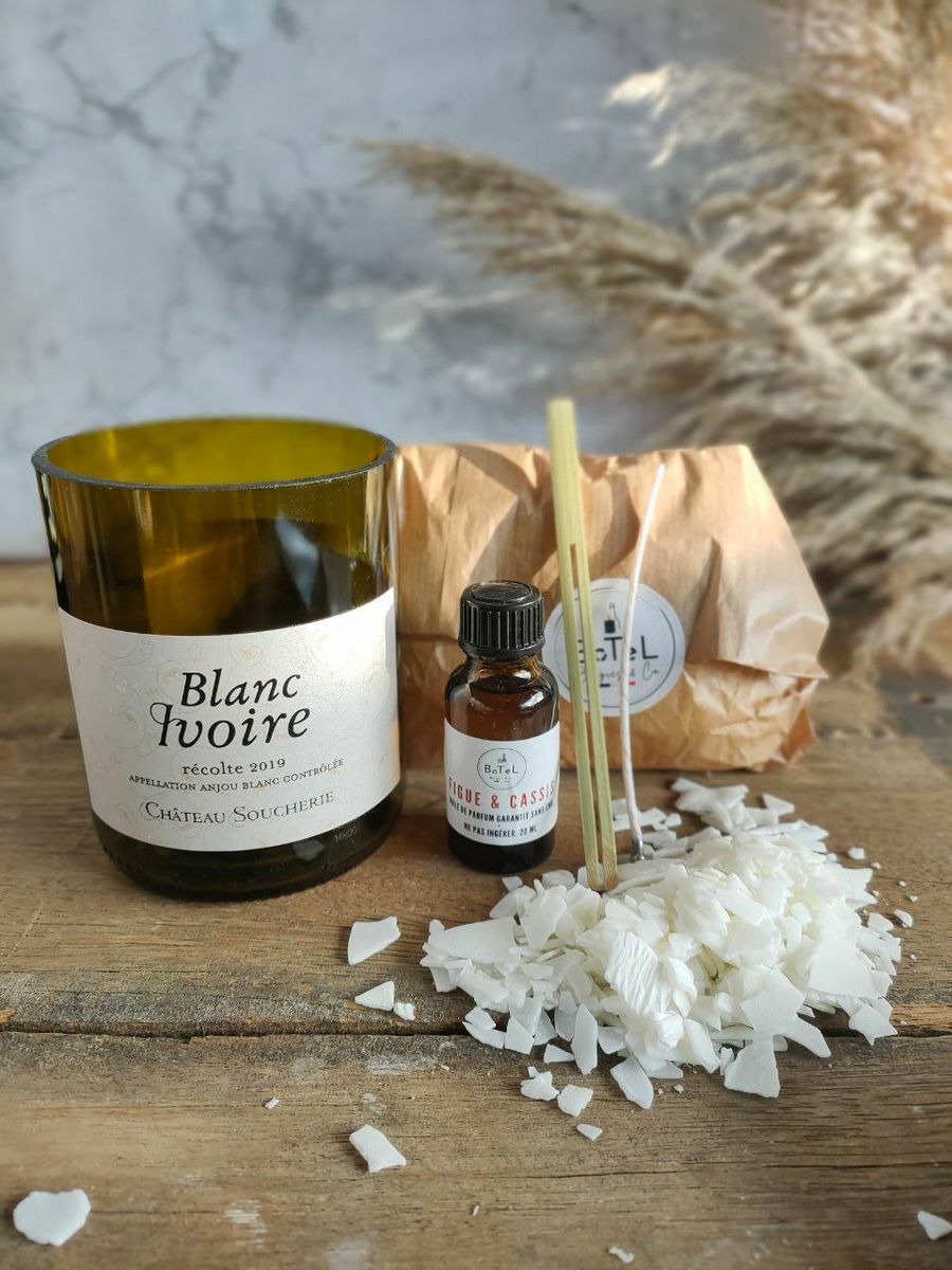 Dans notre kit, vous avez tous les éléments nécéssaires à la fabrication d'un bougie dans une bouteilles de vin.