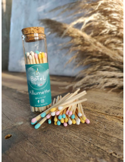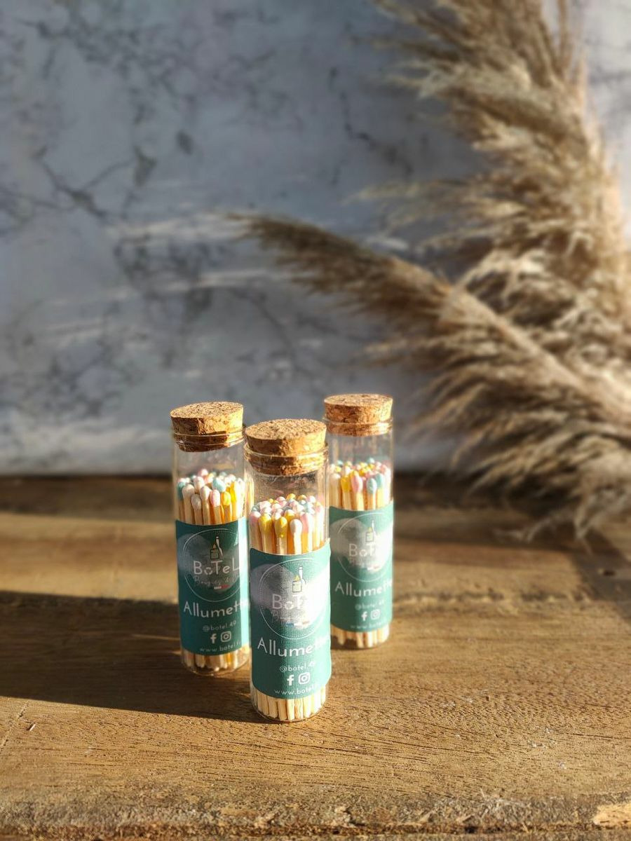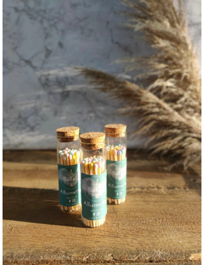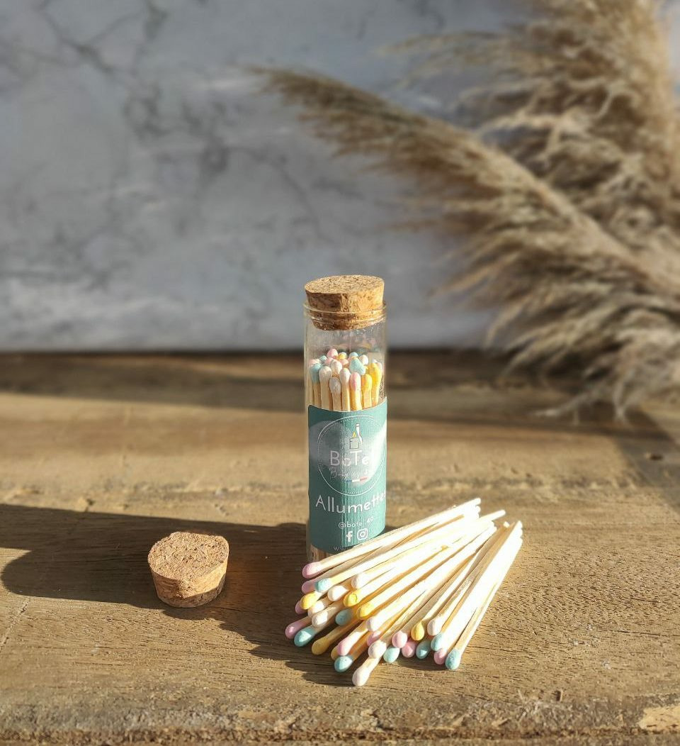 Une fiole en verre remplie de grandes allumettes colorées pour allumer vos jolies bougies !