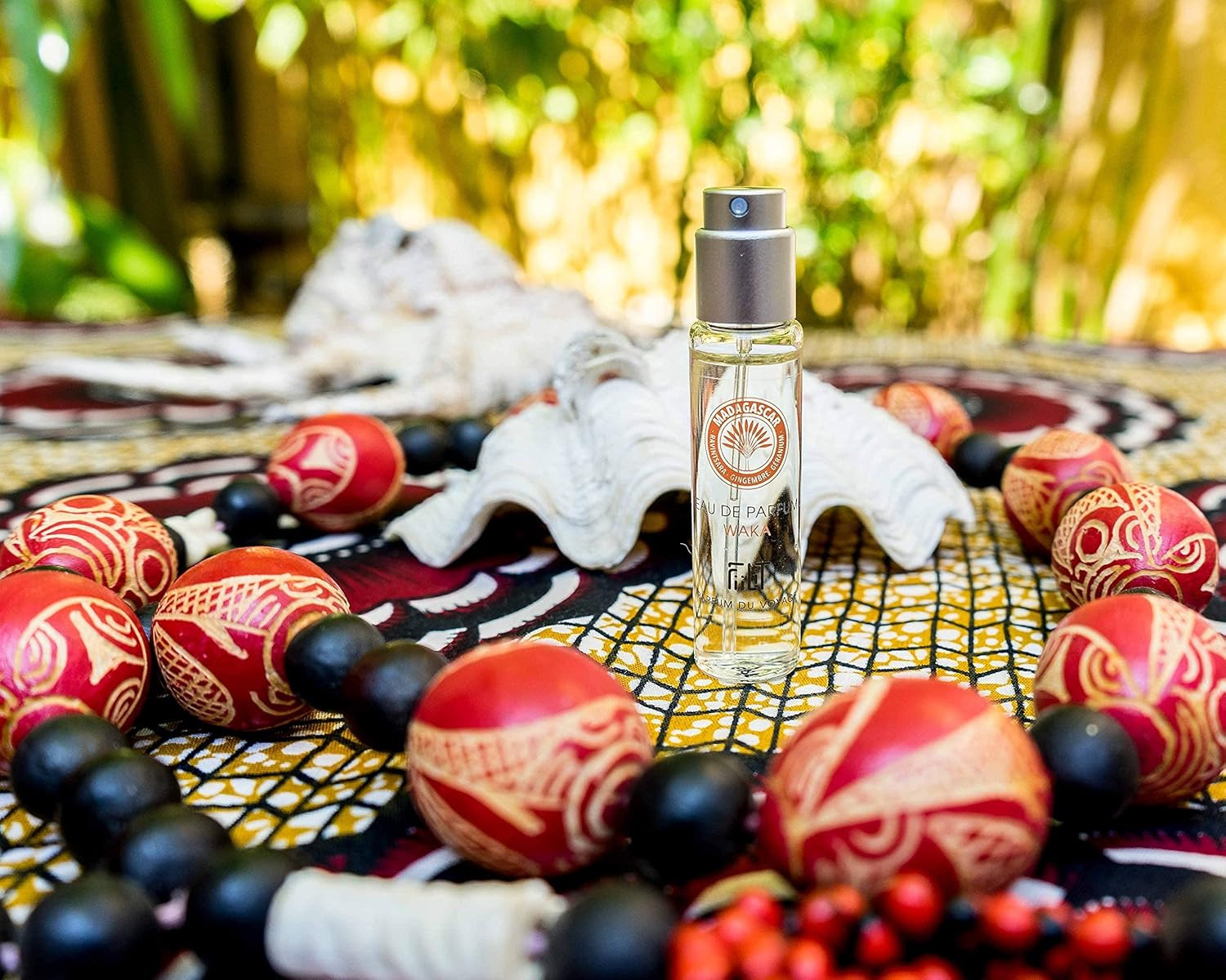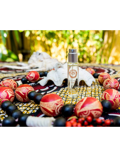 Waka - Madagascar : Ravintsara, Gingembre Bleu, Géranium, Palmasora , Marigold, Patchouli, Vanille, Benjoin.