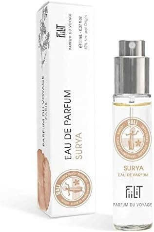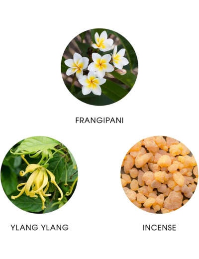 Surya - Bali : Bergamote, élémi, frangipanier, ylang, jasmin, encens, benjoin, santal.