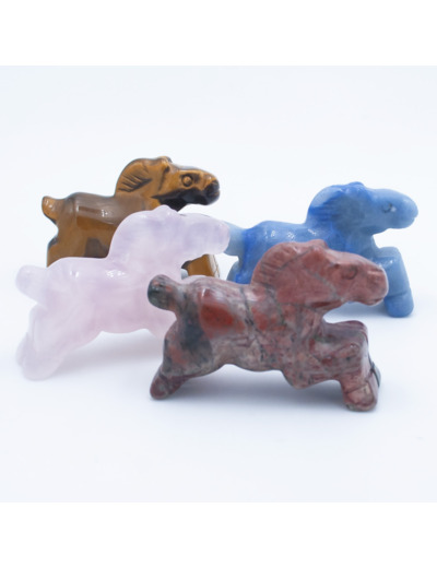 Ces sculptures délicates représentent des chevaux en pleine course, taillés avec soin dans des pierres naturelles aux couleurs et propriétés uniques :