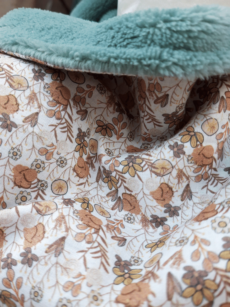 Il est en tissu polaire verte et en tissu en polyester beige avec de petites fleurs très discrètes.