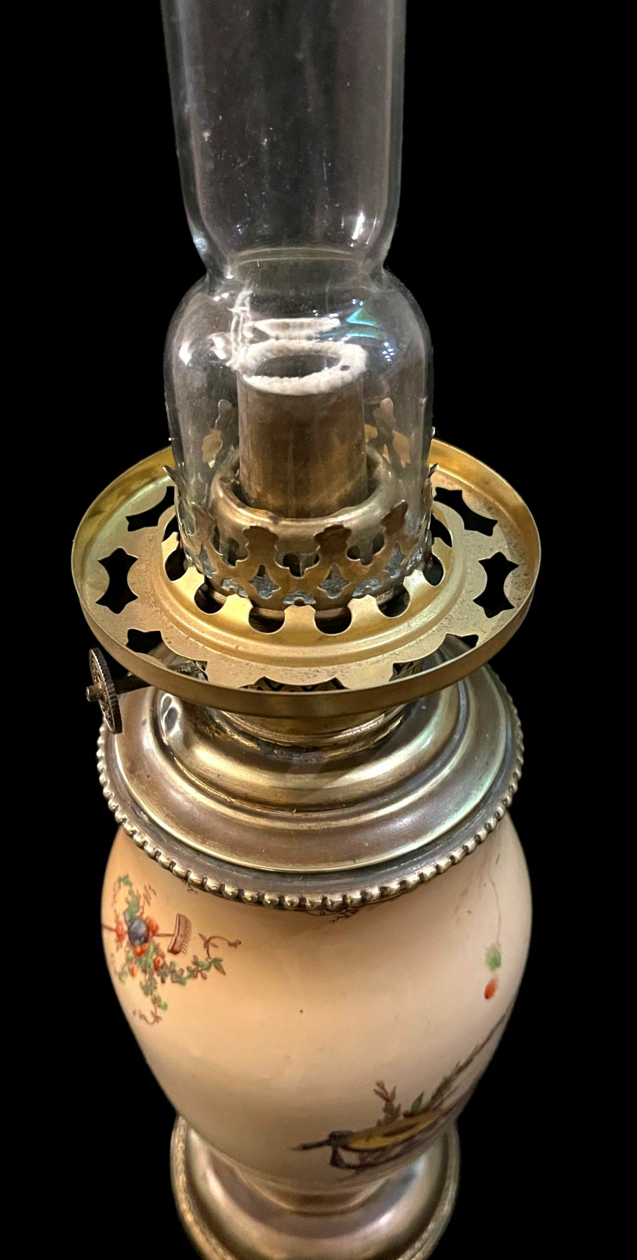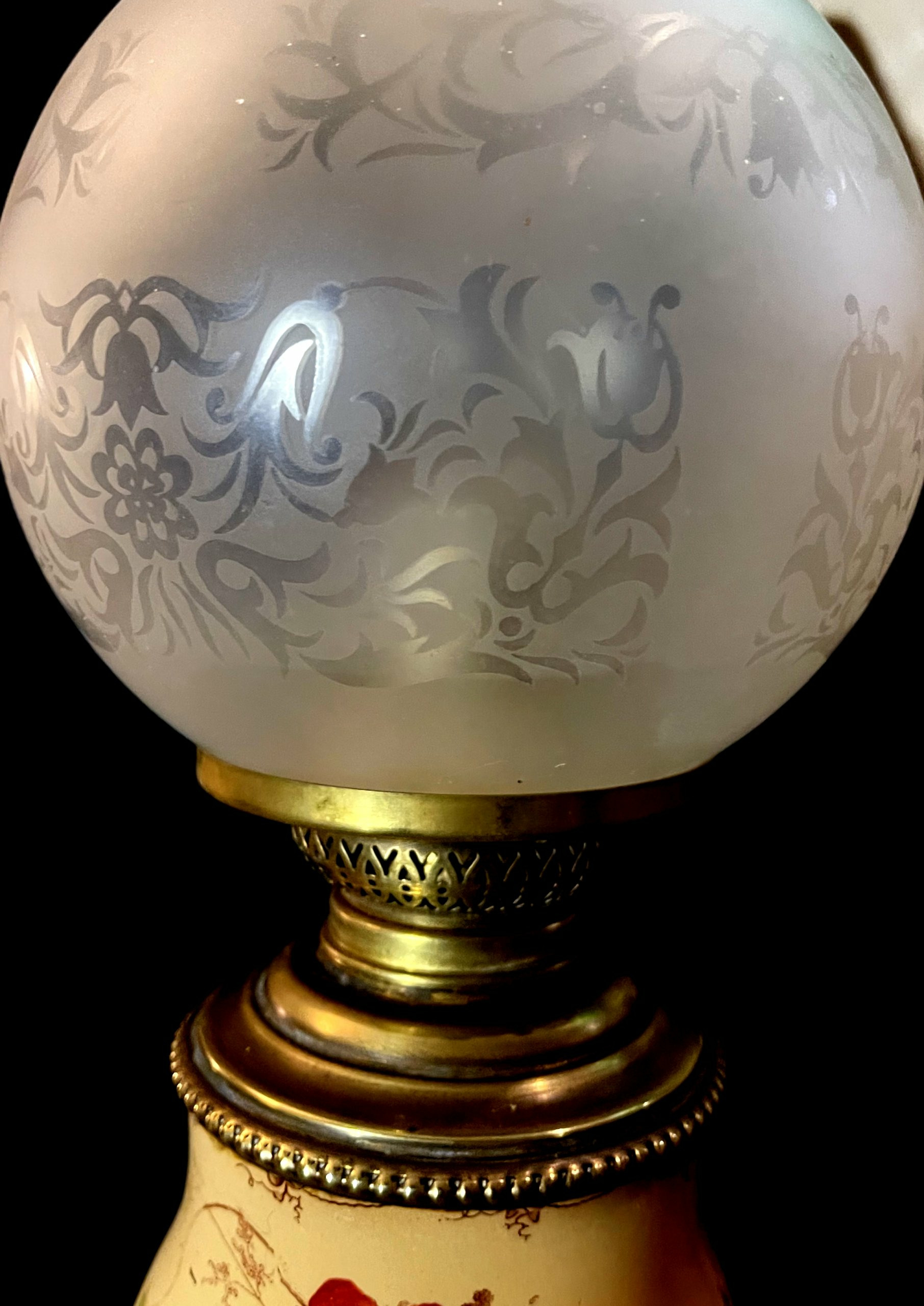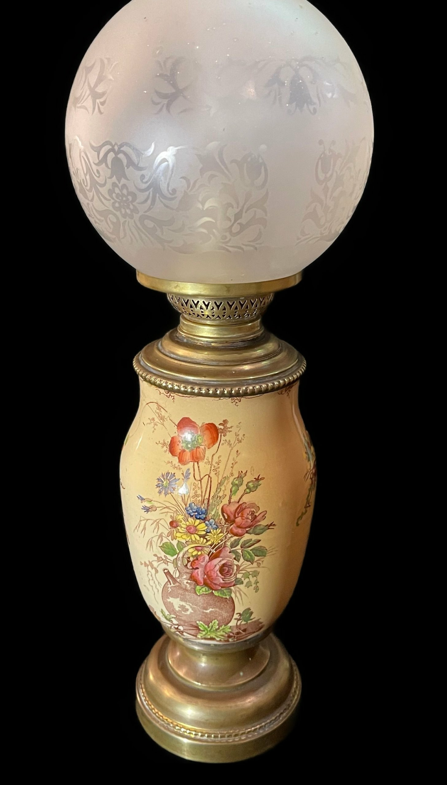 Cette lampe à pétrole restaurée a toujours sa jolie boule d'ornement, en verre dépoli orné de motifs. Cette boule était destinée à contribuer à une diffusion douce de la lumière, sans qu'il y ait de point lumineux violent. Très agréable, évidemment !