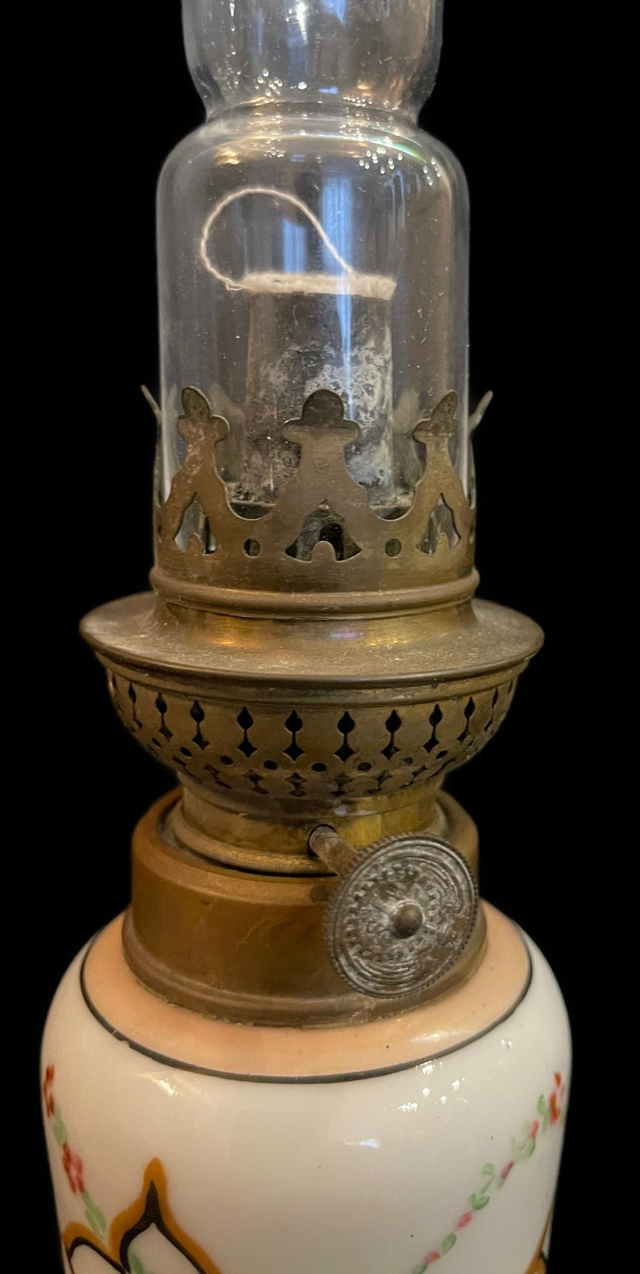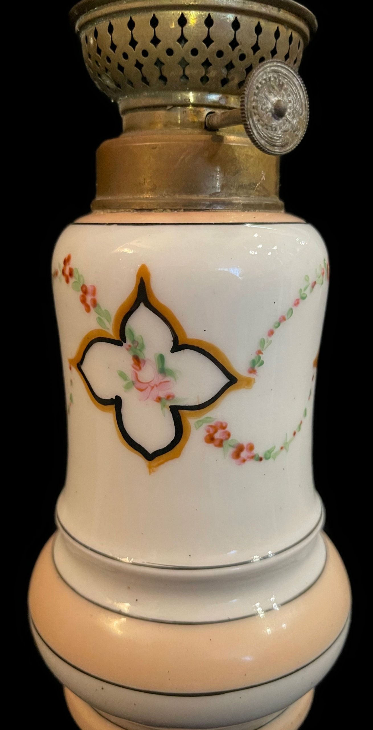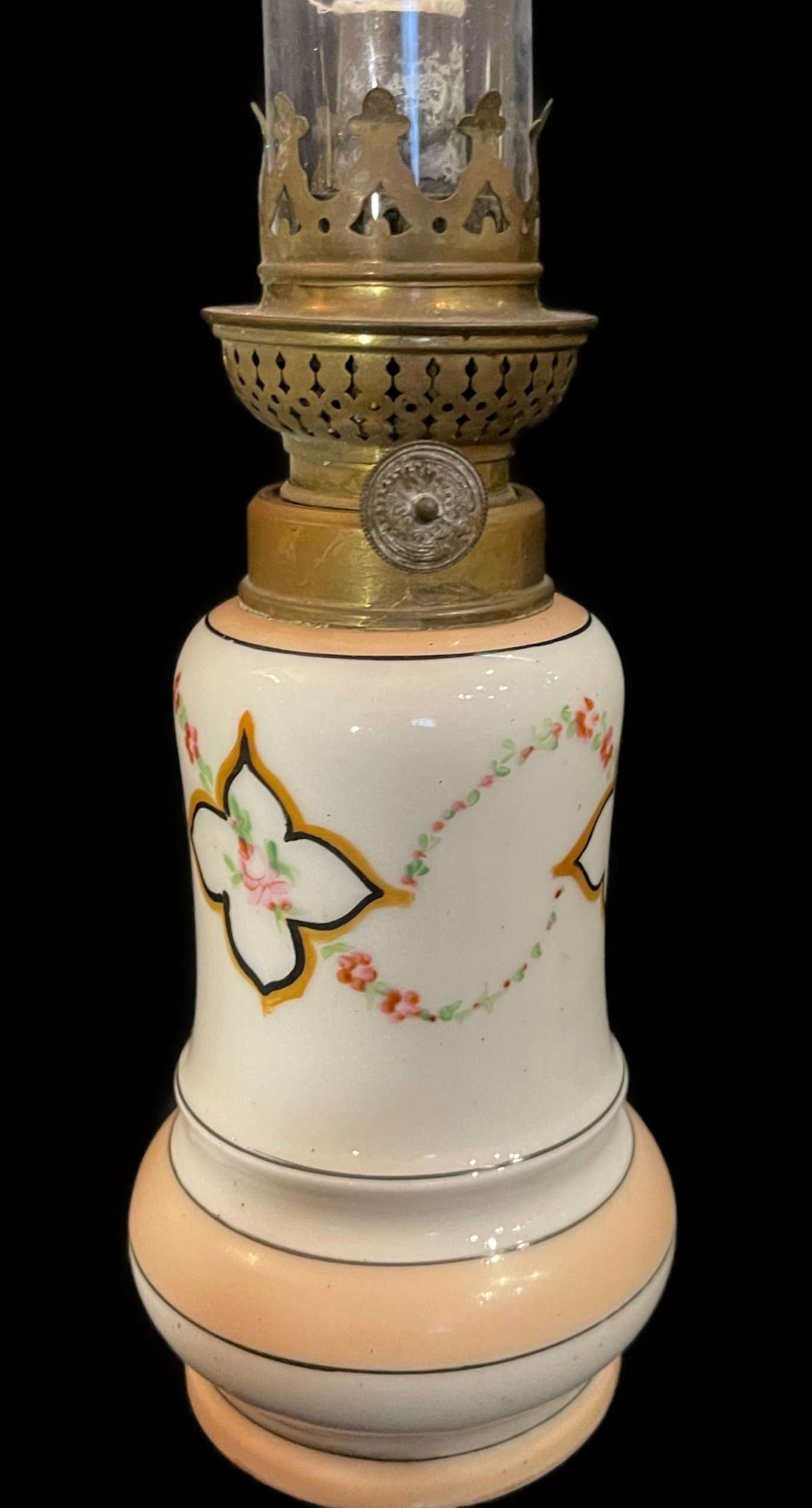 Blanc et crème légèrement orangée, le corps en faïence de cette lampe à pétrole restaurée présente des guirlandes de petites fleurs, avec un motif central curieux, un peu oriental… !