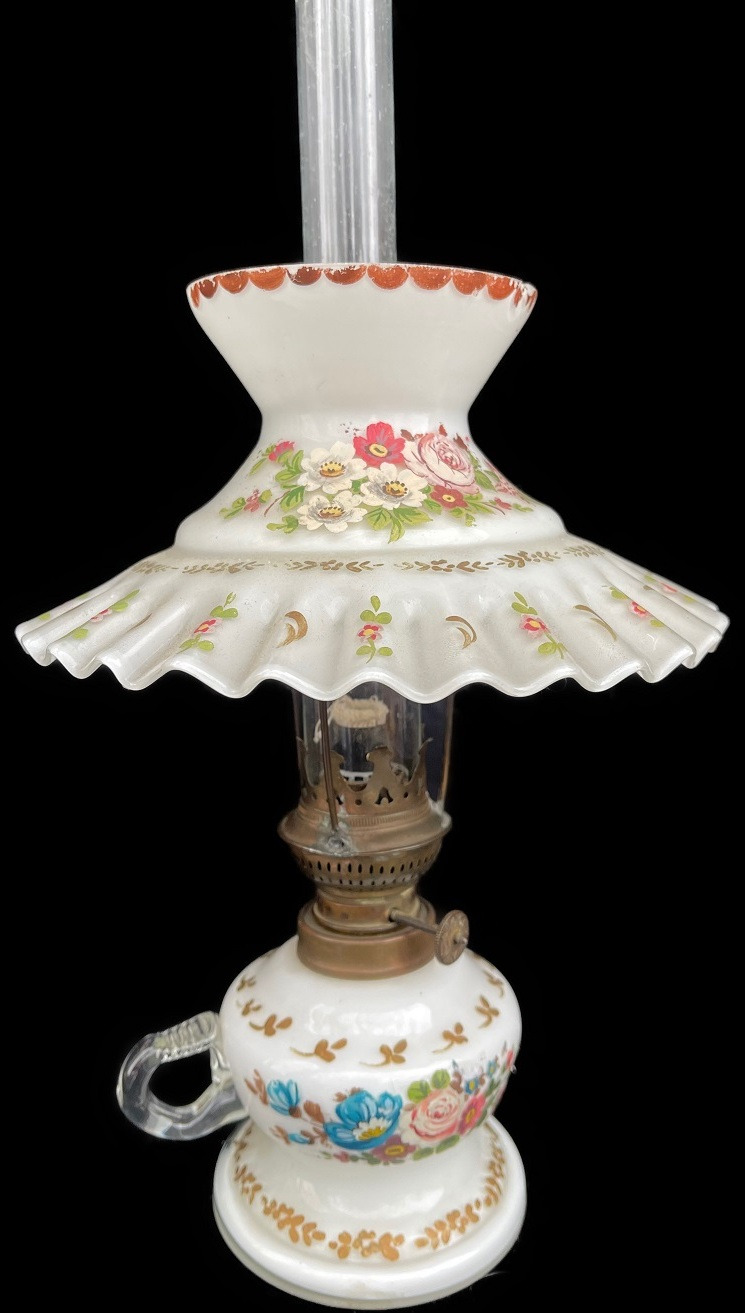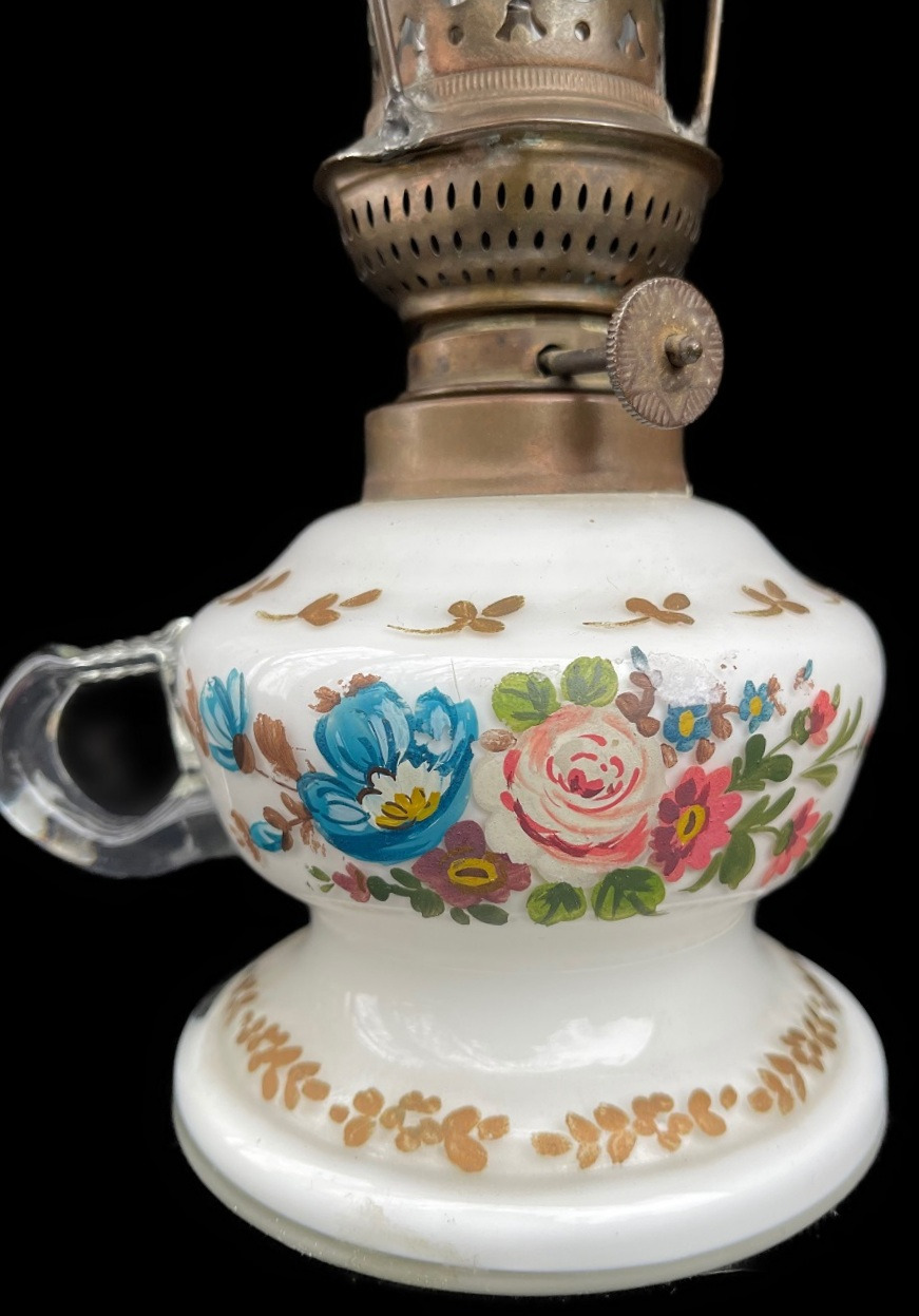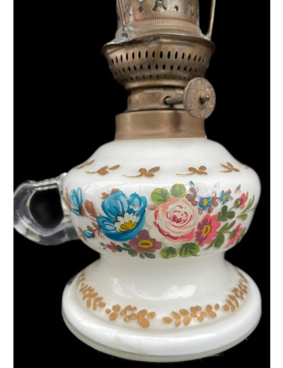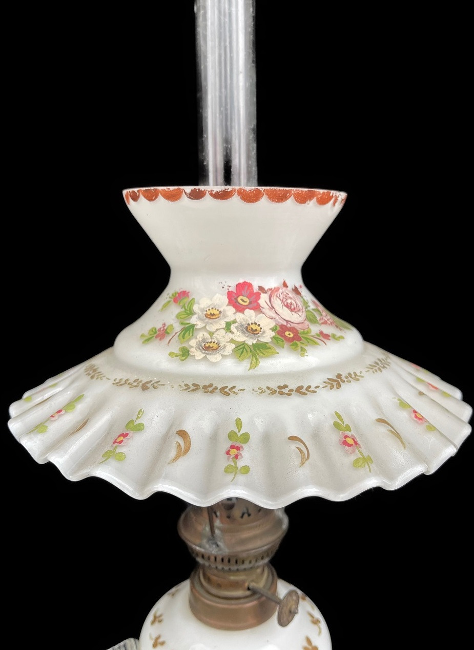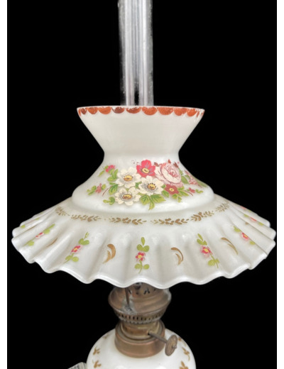 Elle est très délicate, cette jolie lampe à pétrole en pâte de verre. Observer le détail des roses sur le corps avec anse. Observez la finesse des motifs sur l'abat-jour ! Le corps et l'abat-jour sont tous deux en pâte de verre. Bien entendu, cette lampe est restaurée, et elle est en bon état de fonctionnement.
