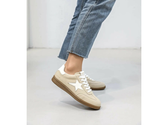 Leur étoile blanche emblématique, discrètement placée sur le côté, illumine la silhouette de la chaussure, tandis que le contrefort blanc rehausse élégamment la teinte beige pour un contraste subtil et harmonieux. Leur semelle fine marron vient parfaire l’ensemble en apportant une touche naturelle et intemporelle.