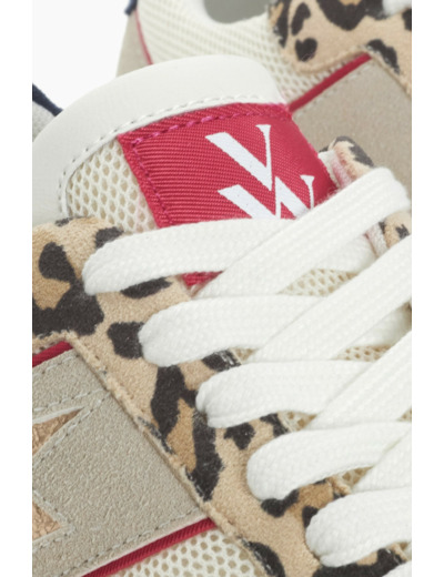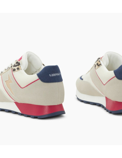 Empiècements latéraux en suédine beige et détails bordés d’un liseré rouge