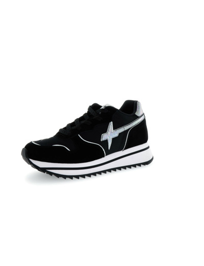 Style : basket running noire, logo latéral irisé, lignes contrastées.