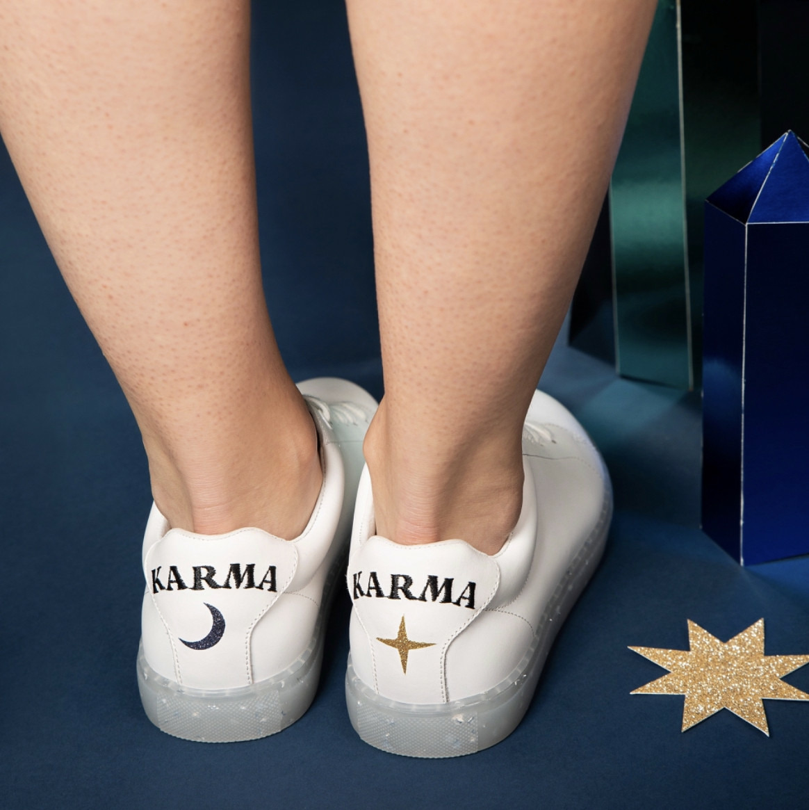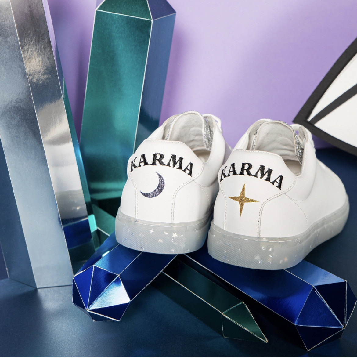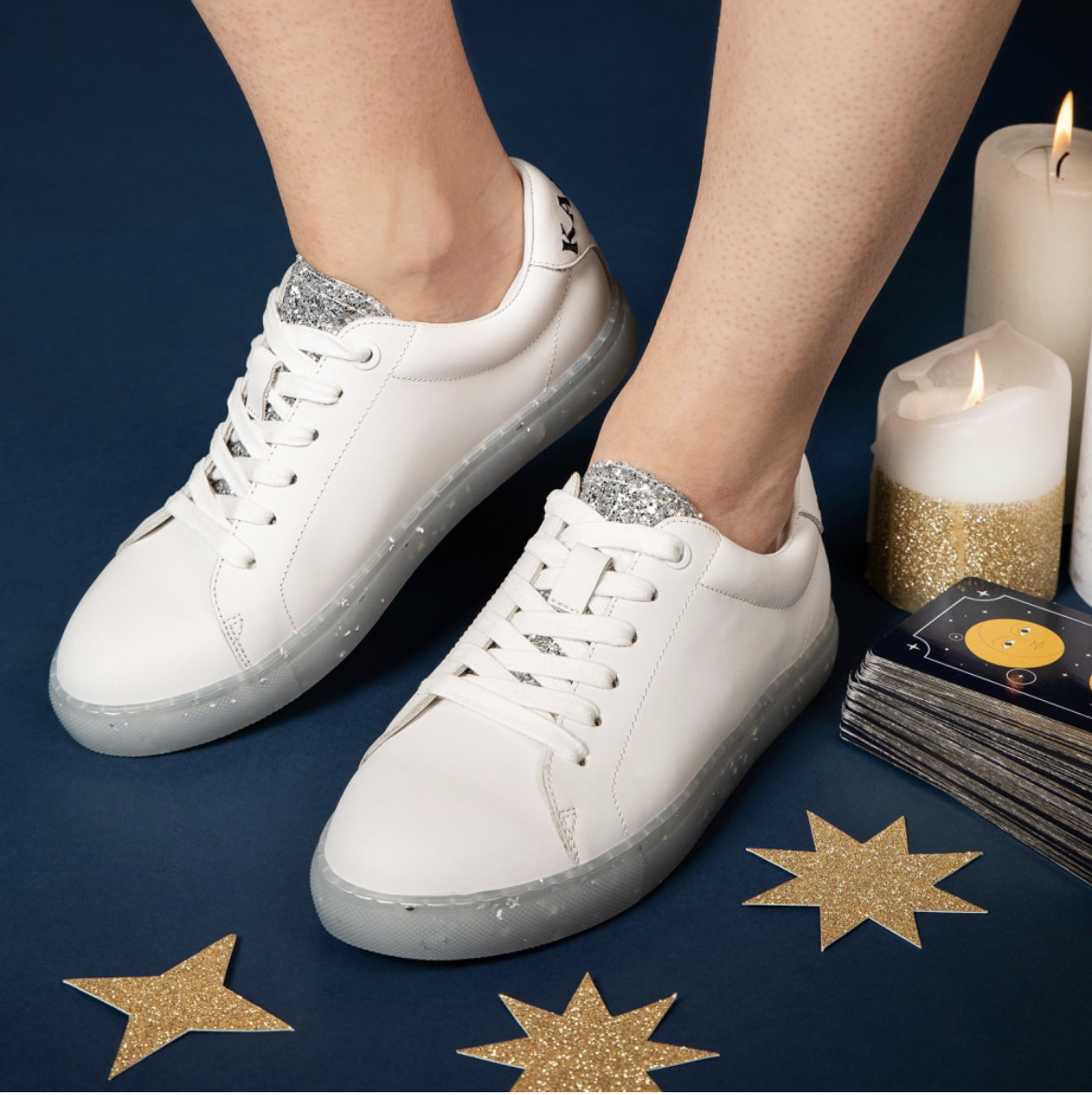 Notre modèle de sneakers Simone se couvre de paillettes argentées à l'occasion de la collaboration avec Caroline Drogo. À l'arrière, le mot karma d'affiche en lettres brodées et invite chacune à devenir la meilleure version de soi-même. Car soigner son karma, c'est avancer dans la bonne direction, en faisant les meilleurs choix possibles... et toujours avec une touche de paillettes !