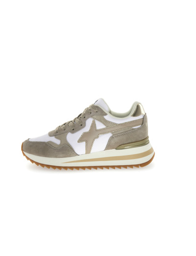 Style rétro-running : tige beige/taupe et blanc, logo latéral, empiècements en daim.