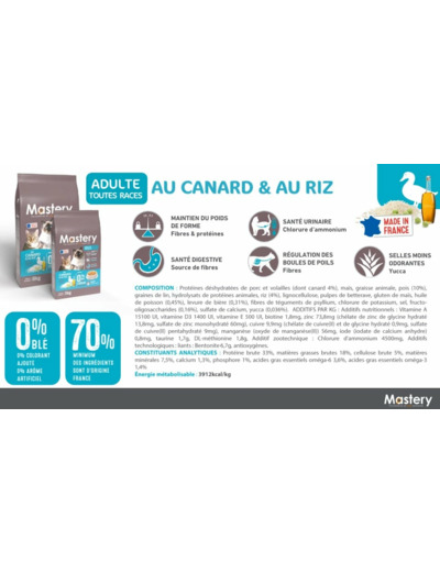 L’aliment Mastery chat canard contient tout ce qui est essentiel pour assurer à votre chat une forme optimale durant toute sa vie d’adulte :