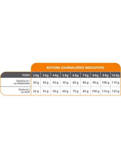 Ces rations sont indicatives et dépendent du statut de votre animal (entier ou stérilisé), de son niveau d’activité et de son mode de vie (intérieur / extérieur).