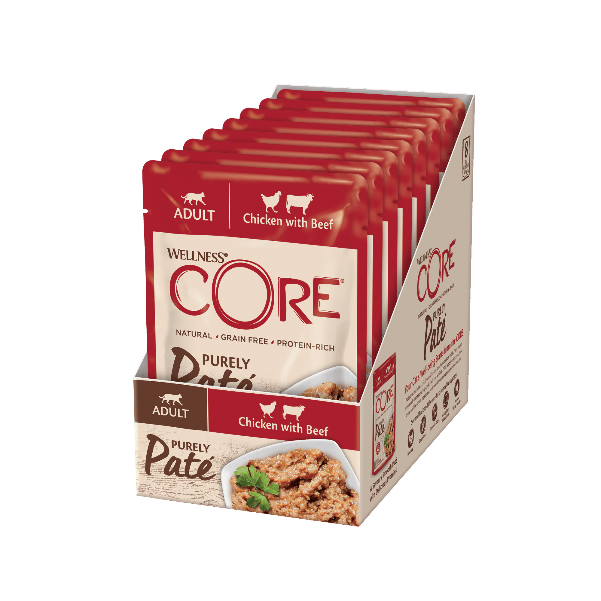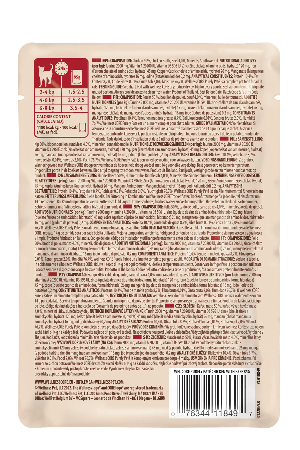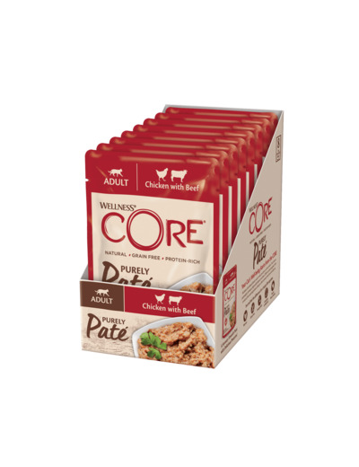 La recette Wellness Core Purely Paté Poulet & Bœuf est conçue pour répondre aux besoins fondamentaux du chat adulte, en s'appuyant sur une alimentation carnée inspirée de son régime ancestral. Cette formule est idéale pour les chats qui réclament une texture fondante et une forte concentration en protéines animales.