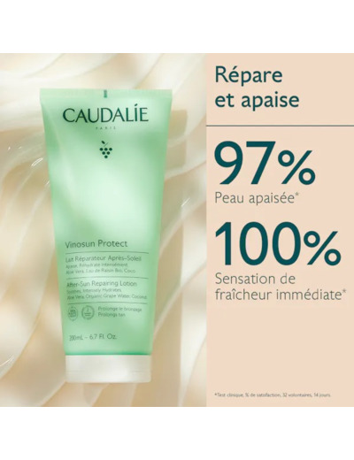 Visage et corps, le Lait Réparateur Après-Soleil Vinosun Protect nourrit, répare et apaise les peaux échauffées après chaque exposition au soleil tout en prolongeant le bronzage de 2 semaines. Enrichi en extrait d'aloe vera, sa texture non collante offre une sensation immédiate de fraîcheur et laisse la peau douce, hydratée et délicatement parfumée.