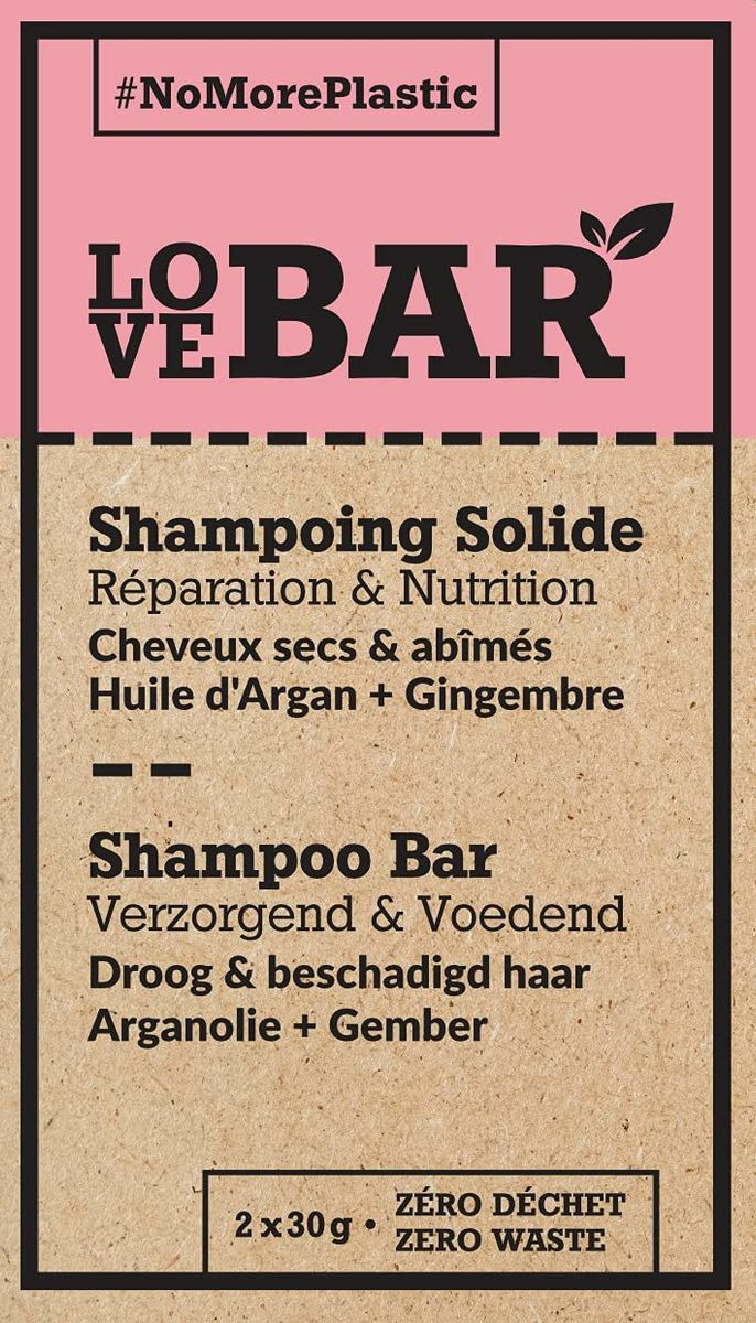 Un shampoing solide 100% naturel pour les cheveux secs et abîmés. Il se transforme en mousse et nettoie parfaitement le cuir chevelu et les cheveux. Il contient : - de l'huile d'argan, qui nourrit et régénère les cheveux secs et abîmés - de l'huile de gingembre qui nourrit, rafraîchit et tonifie le cuir chevelu - du beurre de cacao qui comble les brèches des cheveux pour les rendre plus faciles à coiffer - de l'huile de bois de rose aux effets aromathérapeuthiques Love Bar vous permet d'être eco-friendly de la tête aux pieds ! 1 LoveBar représente 2 litres d’eau et 2 bouteilles en plastique économisés Compositions 100% naturelles, à base d’huiles essentielles certifiées Bio Sans huile de palme Vegan Formats pratiques et jolis Emballages sans plastique, 100% bio-dégradables 1 boîte = 2 LoveBar divise ses soins en deux petits cœurs de 30 grammes chacun : vous êtes assuré de ne plus gâcher de produit. Une fois le premier fini, le second vous attend intact dans sa boîte ! Pour vos voyages, n’en prenez qu’un !