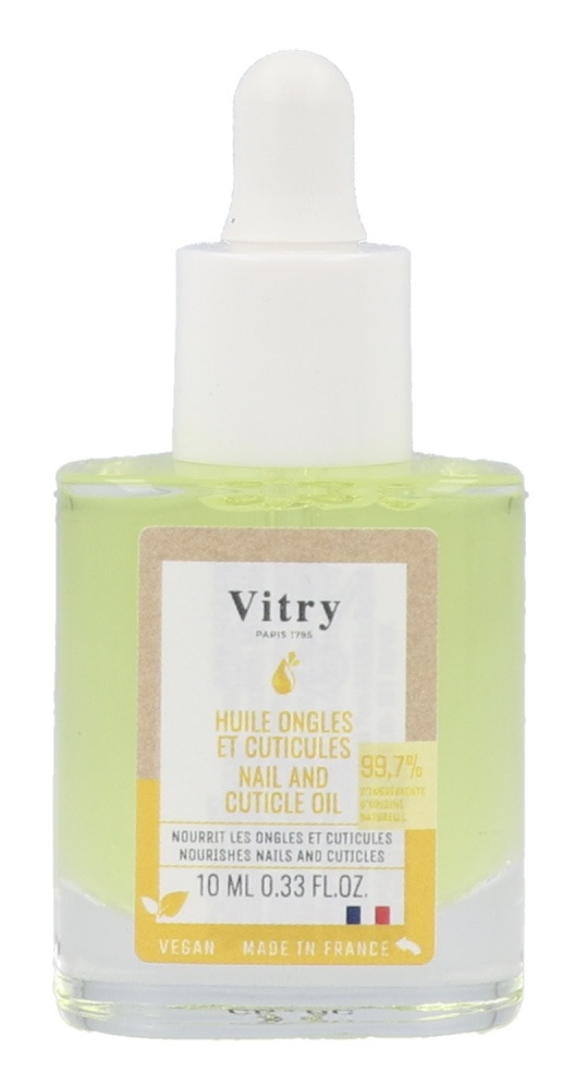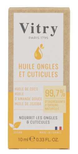 L'Huile Ongles et Cuticules Vitry est formulée avec 99,7 % d'ingrédients d'origine naturelle : elle allie 3 huiles précieuses (huile d'amande douce, huile de coco et huile de jojoba) pour nourrir les ongles et assouplir les cuticules.