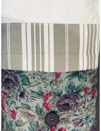 Descriptif : Drap blanc, toile à matelas, tissus fleuri gris/mauve/fuchsia, 1 bouton en nacre véritable, 1 bouton noir en résine, mousse de remplissage provenant de coussins et d'oreillers sourcés en recyclerie et lavés à 60°C.