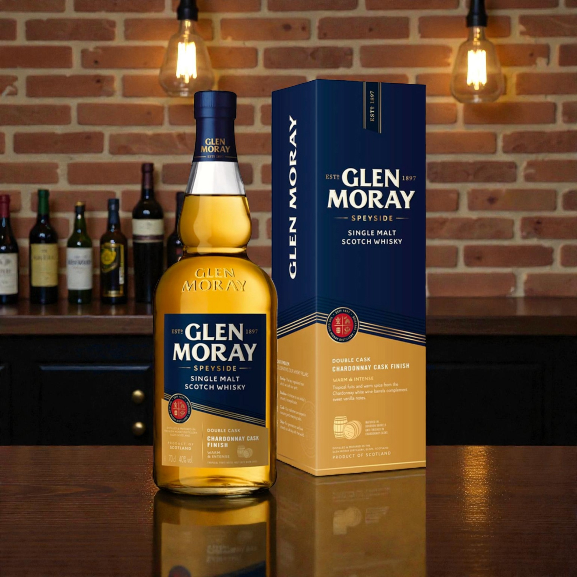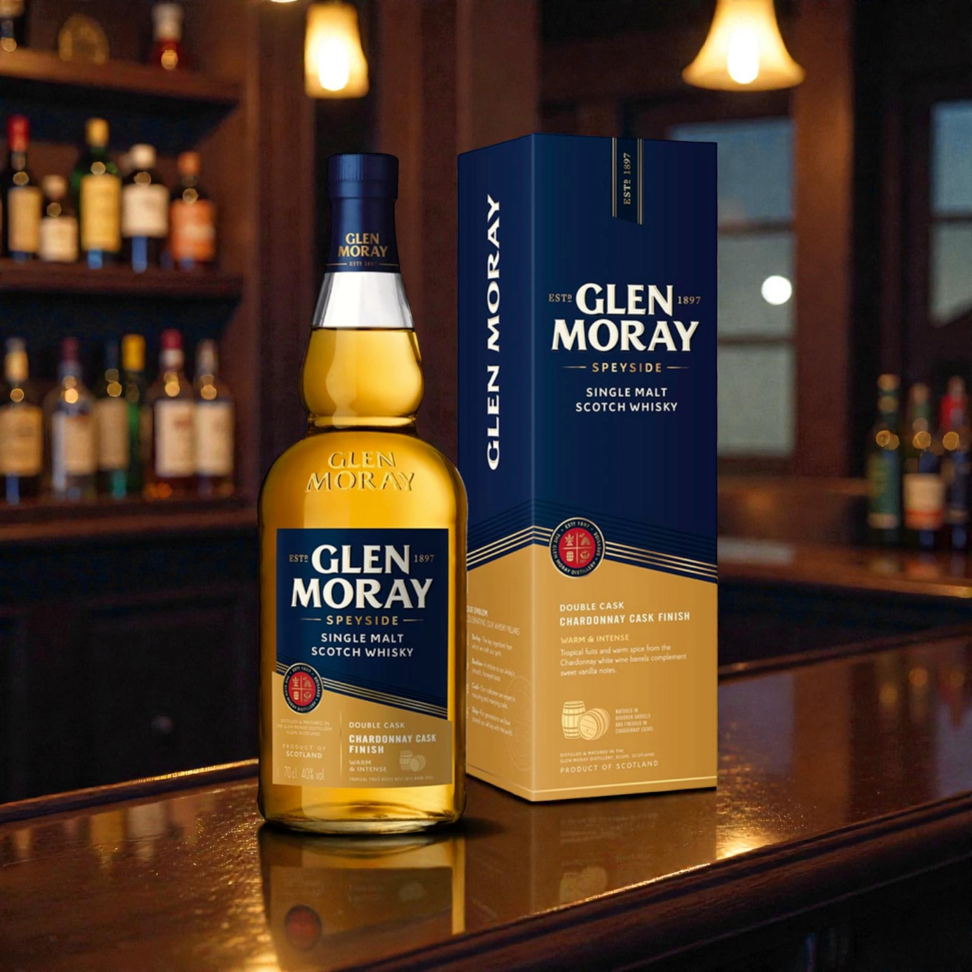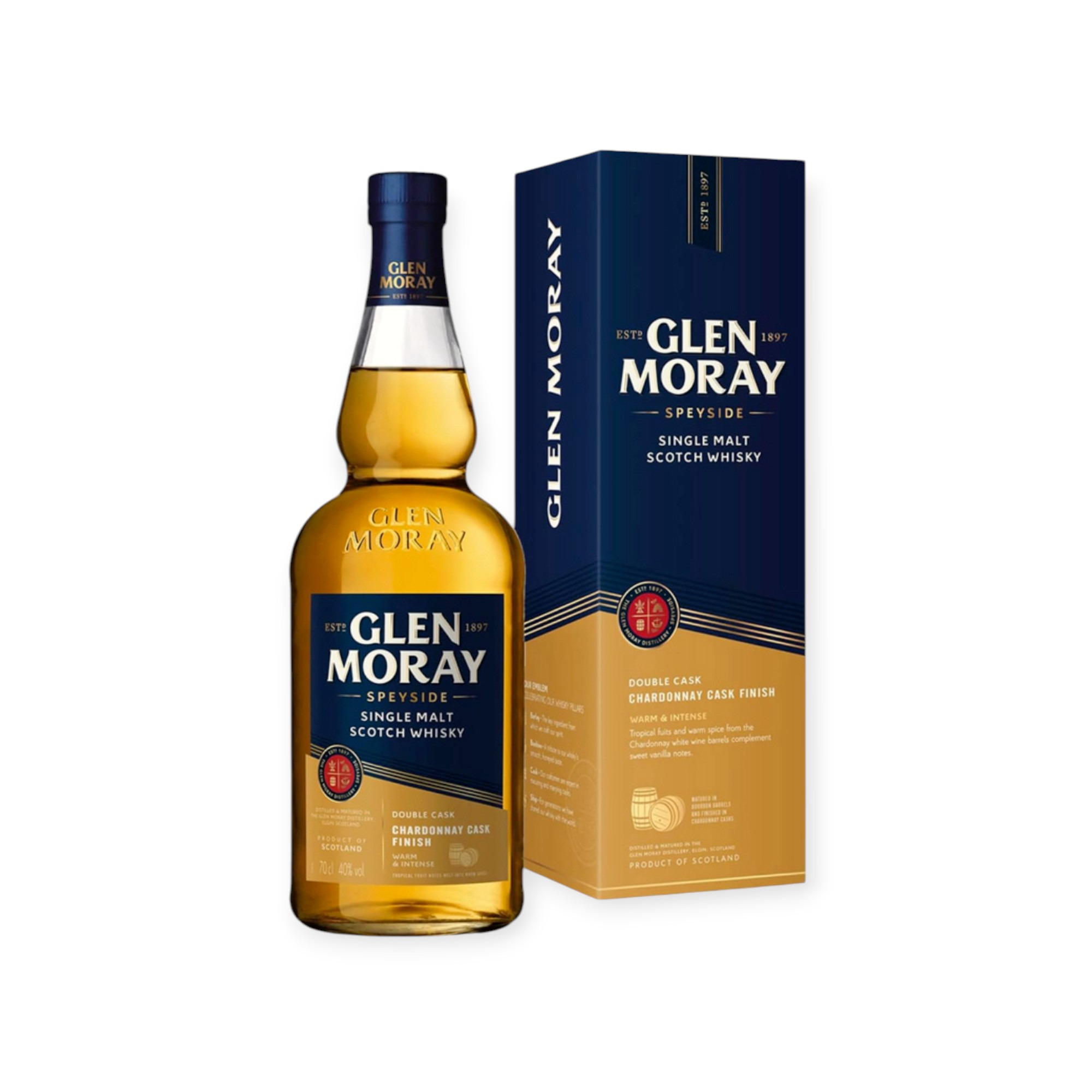 Le Glen Moray Explorer Chardonnay Cask est un single malt innovant du Speyside, conçu pour les amateurs de whiskies frais et aromatiques. Après un vieillissement en fûts de bourbon américain, il bénéficie d’un affinage en fûts de Chardonnay français, apportant élégance et vivacité.