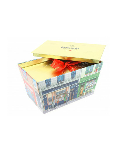 Cette jolie boite en métal au motif d'une rue commerçante et d' une boutique Leonidas renferme un ballotin de 500gr assortiment.
