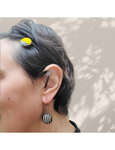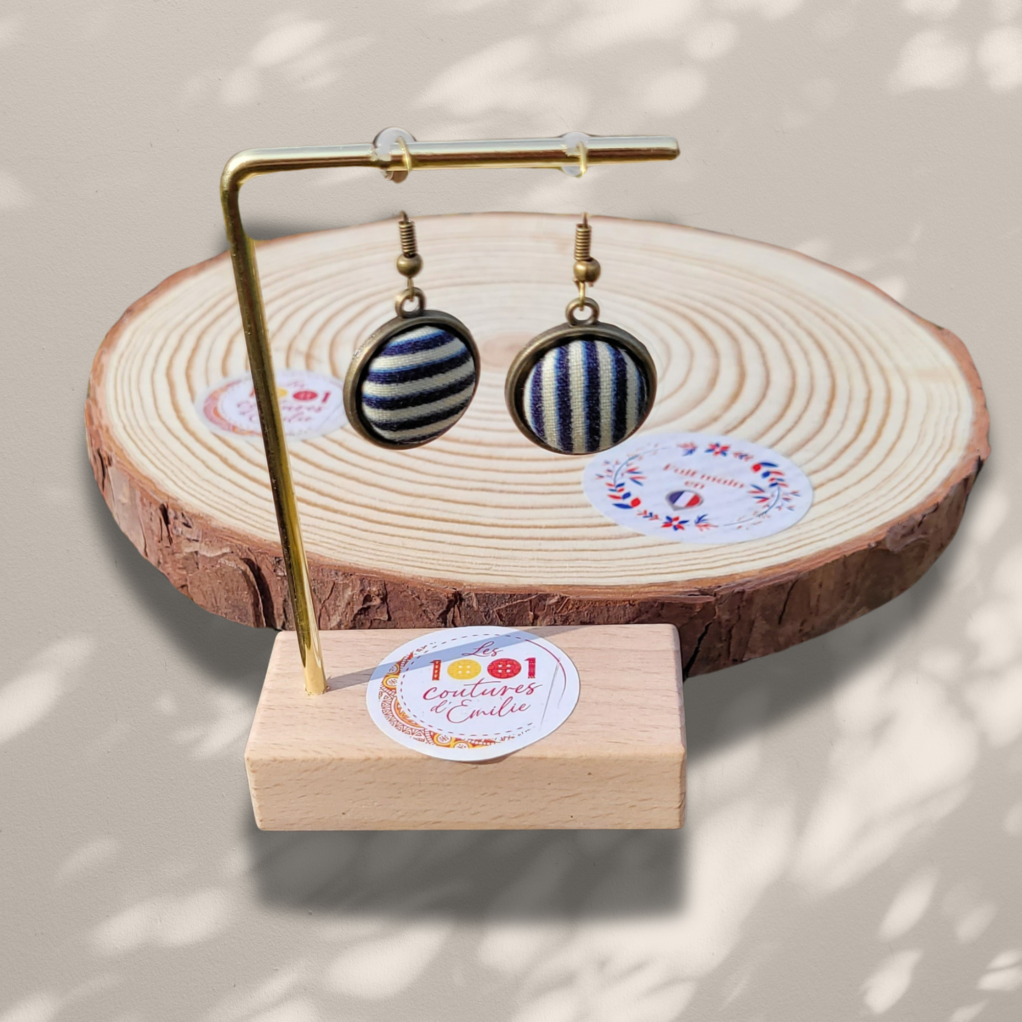 Boucles d'oreilles bouton "Murano" Mini, pendantes et rondes, réalisées en tissu wax rayé marine et blanc esprit marin, idéales pour sublimer vos tenues.