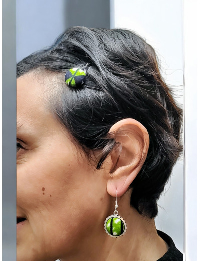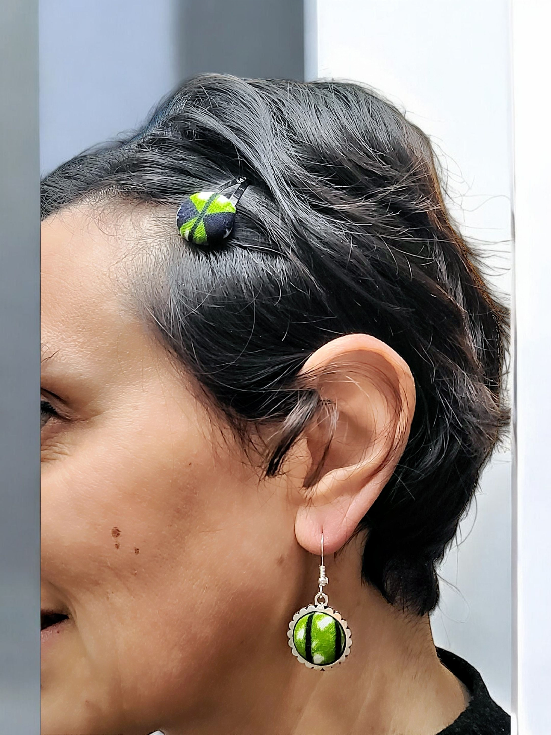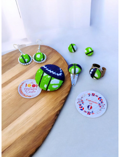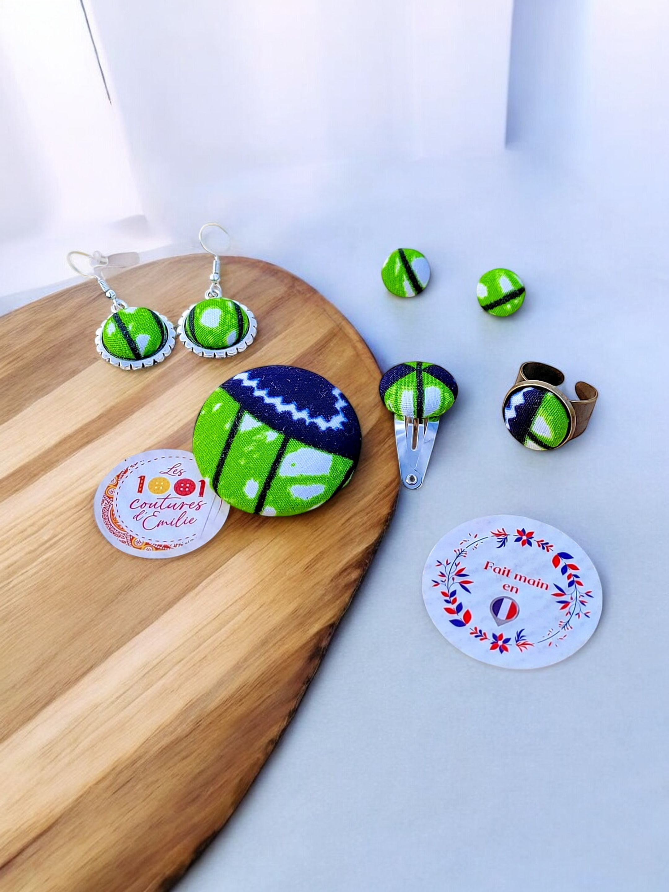 Boucles d'oreilles bouton "Murano" mini, pendantes et rondes, réalisées en tissu wax vert et blanc, idéales pour sublimer vos tenues.
