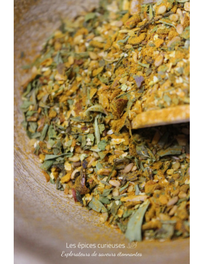 Cette composition exclusive comprend du Curcuma, de l'ail échalote, du cerfeuil, du basilic, du persil, de la ciboulette, du piment doux Niora, du SESAME doré, du poivron rouge, de la menthe douce et de l'estragon.