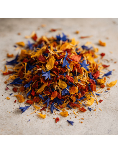 Immergez-vous dans l'univers floral avec Aurore – Fleurs comestibles. Ce mélange de pétales de bleuet, de tournesol, de soucis, de carthame et de rose fait voyager vos sens, avec sa gamme de couleurs vibrantes et ses saveurs subtiles.