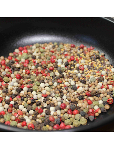 Chaque grain de ce poivre a été soigneusement sélectionné pour ses propriétés gustatives exceptionnelles. Le poivre noir, le poivre vert, le poivre blanc et les baies roses apportent une explosion de saveurs piquantes et fruitées. La coriandre, quant à elle, ajoute une touche de fraîcheur, tandis que la moutarde jaune et noire donne un piquant subtil à l'ensemble.