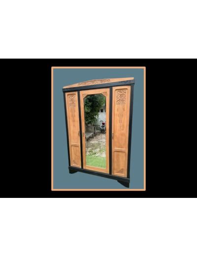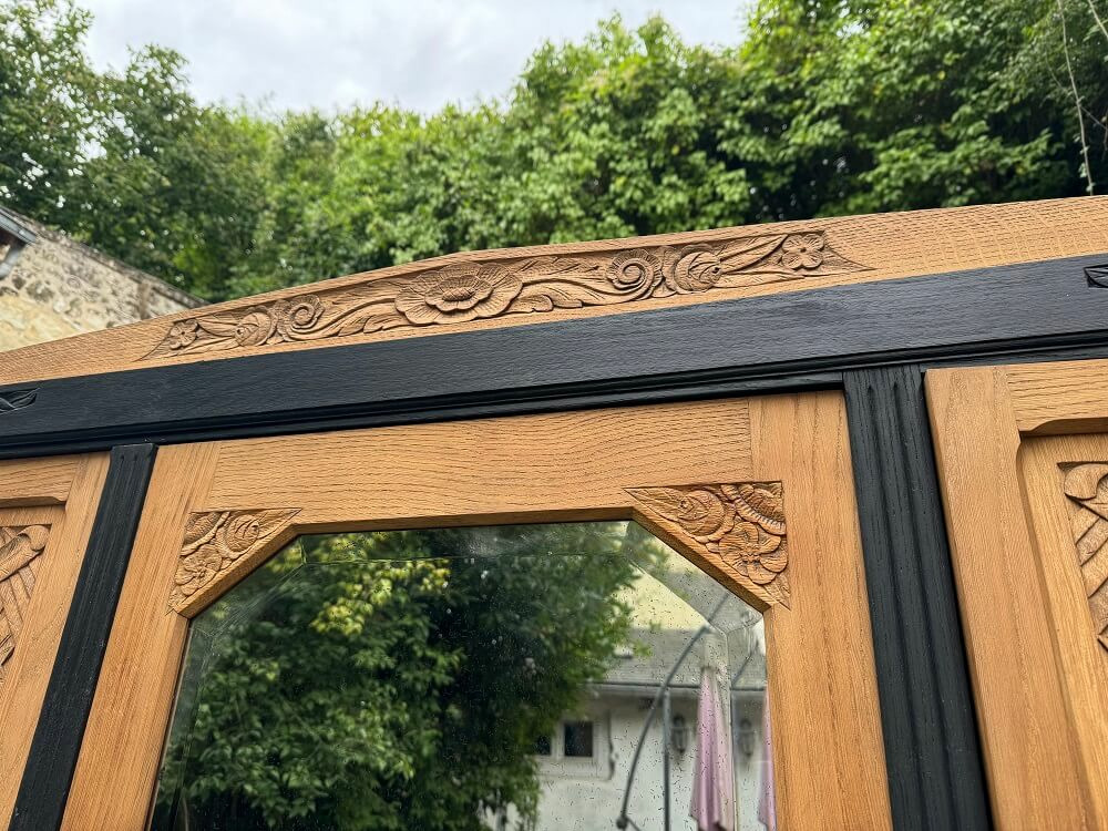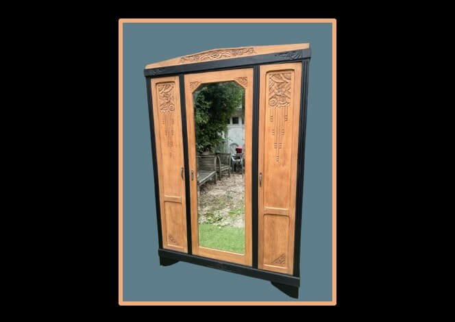 Et si cette armoire à glace peut être considérée comme une «belle pièce», nos goûts contemporains peuvent être la trouver un peu lourde… qu'à cela ne tienne, je l'ai allégée en divisant son ensemble par des lignes sombres qui, en plus, font ressortir la douceur du chêne.
