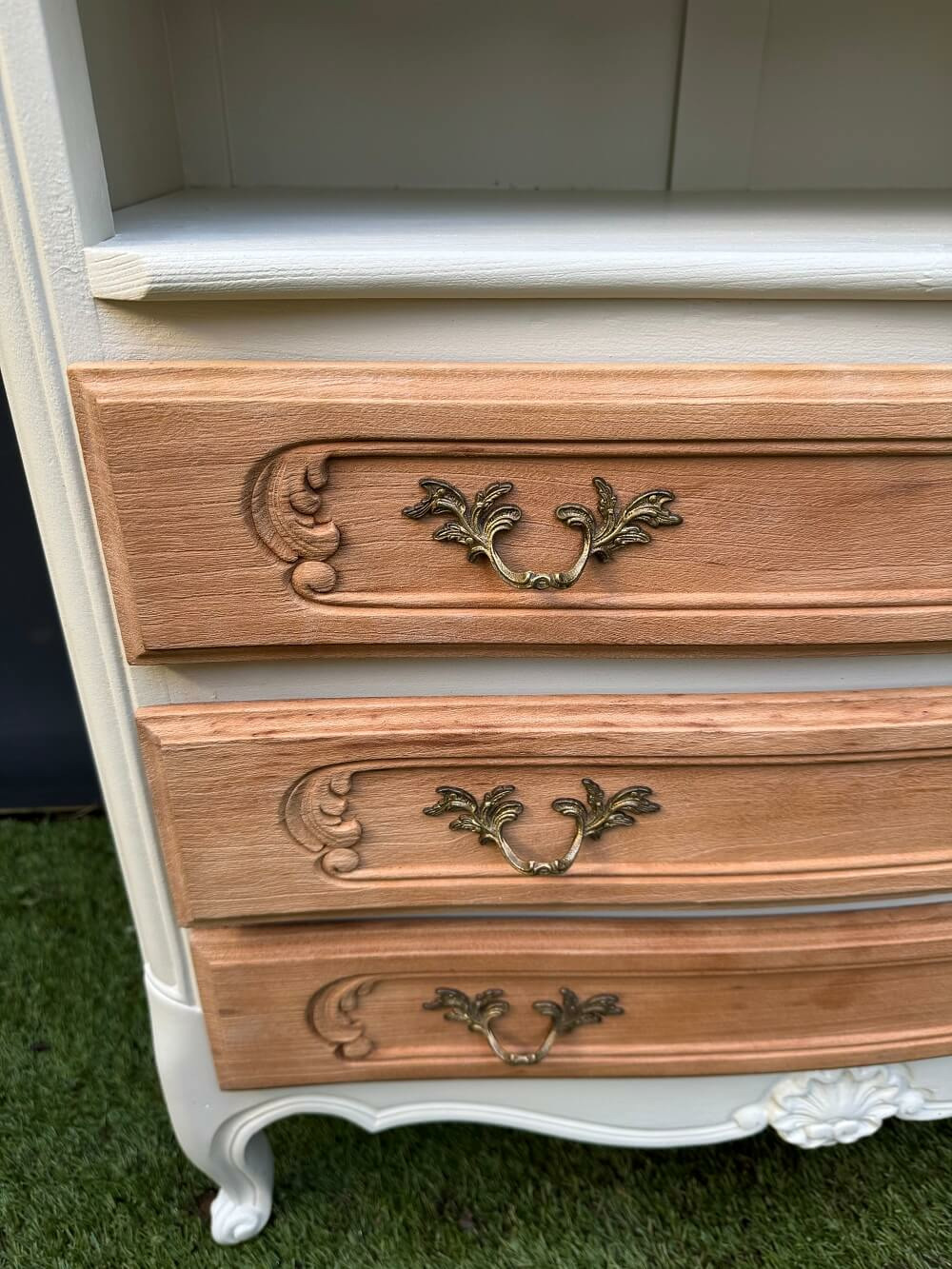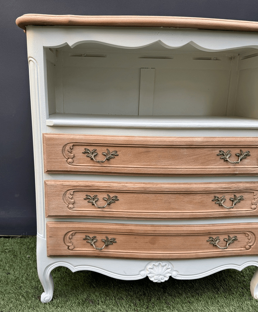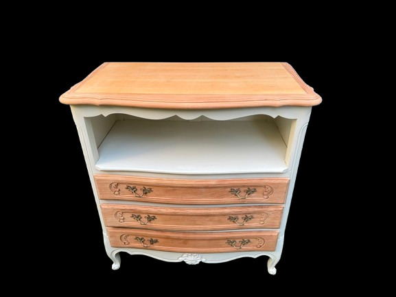 C’est un peu l’adjectif qui me vient à l’esprit avec cette jolie commode en merisier proposant, au-dessus des terroirs, une niche au pourtour ouvragé.